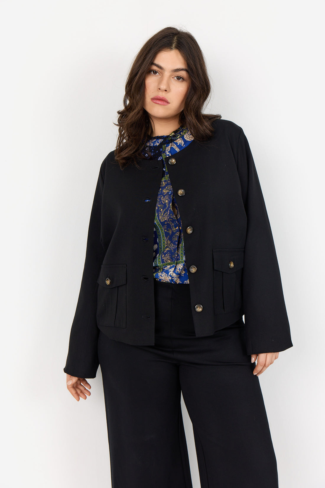 Smuk og elegant jakke med rund halsudskæring, knaplukning foran samt to klaplommer. Sæt den sammen...