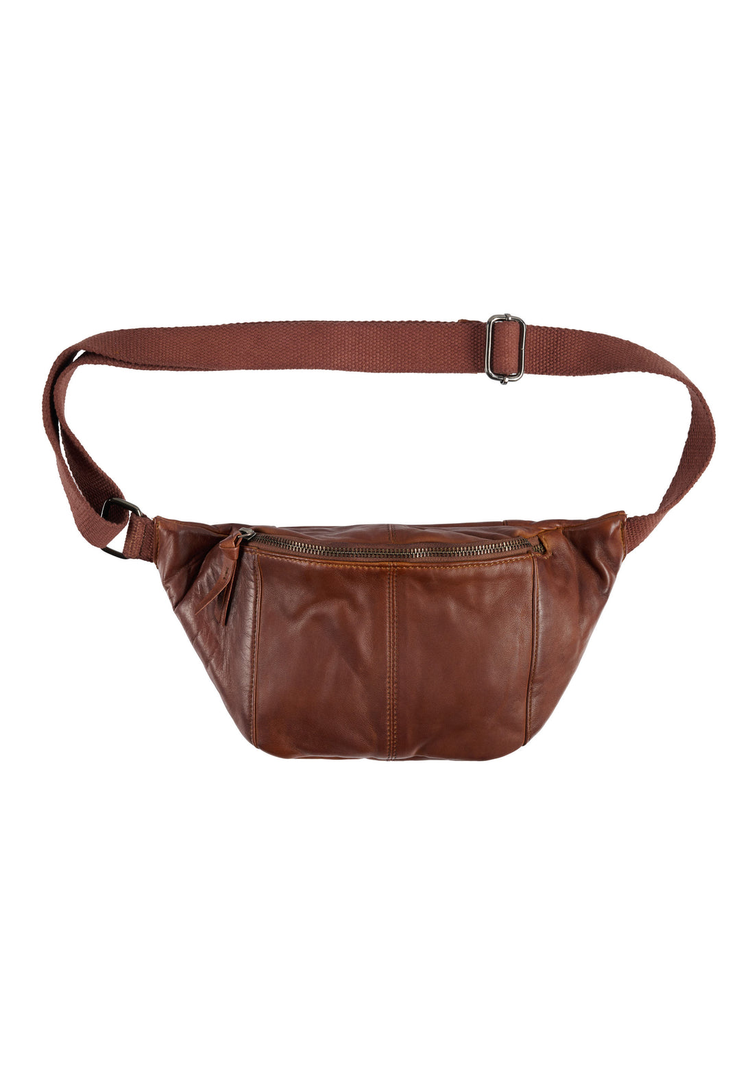 Smart bumbag i blødt, vasket læder med to udvendige lynlåslommer og én indvendig lynlåslomme. Tasken...
