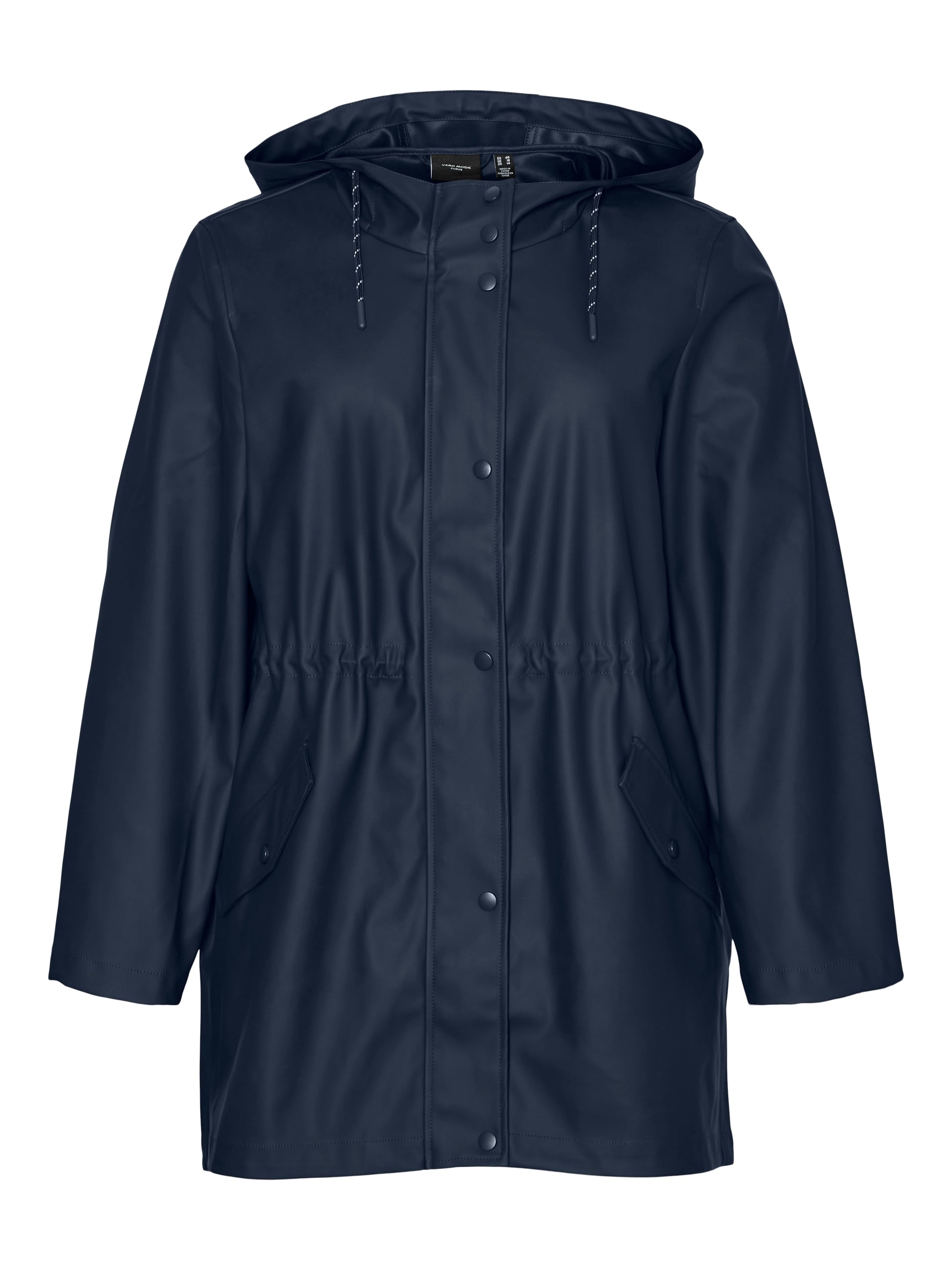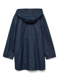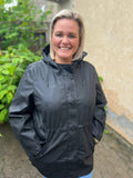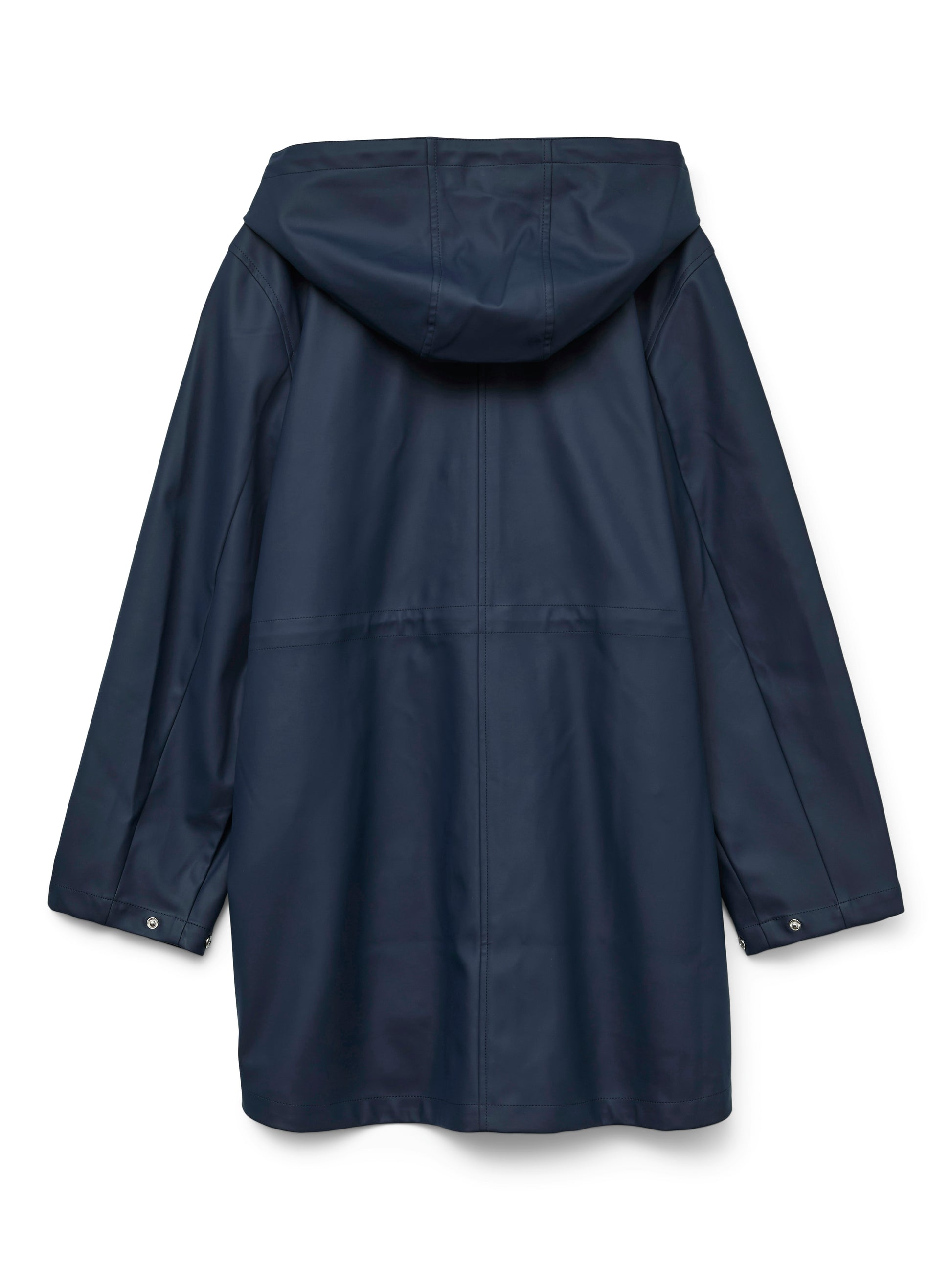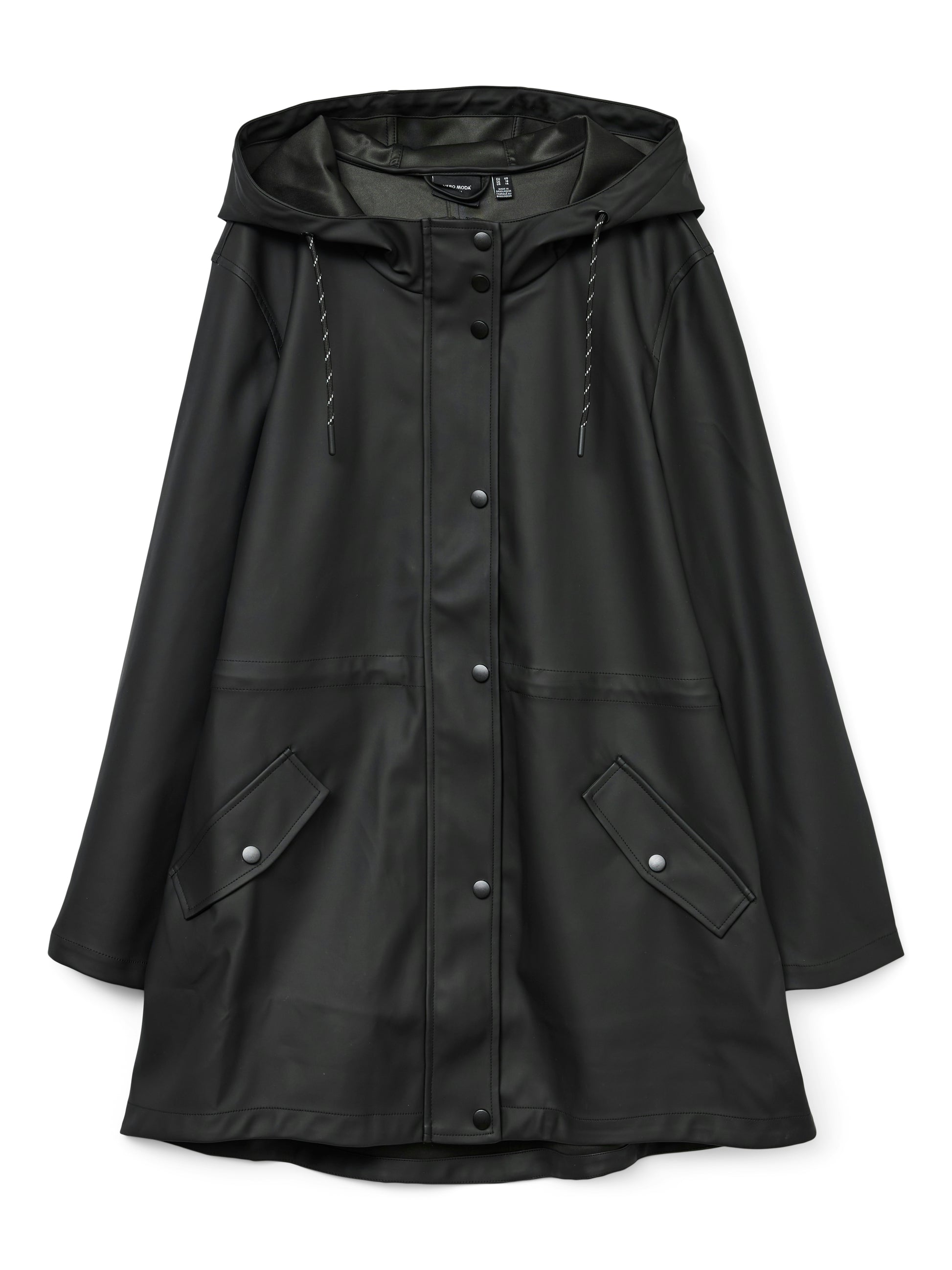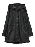 Klassisk regnjakke i sort med mat finish og et enkelt, stilrent udtryk. Jakken har praktisk hætte med snøre, gennemgående lynlås og trykknapper foran. De skrå lommer med klap og knap giver både funktion og et smart look. Perfekt til de våde dage, hvor komfort og stil går hånd i hånd.