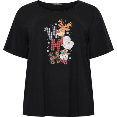 Sort T-shirt i blød kvalitet med et festligt julemotiv på fronten. Printet består af teksten “Ho Ho Ho” pyntet med søde julefigurer som rensdyr, snemænd og nisse, der skaber en hyggelig og sjov stemning. T-shirten har rund hals, korte ærmer og en afslappet pasform – perfekt til at skabe julehumør både til hverdag og til årets hyggelige sammenkomster.