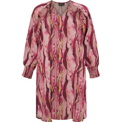 Tidløs kjole i smukke, fine farver der passer til enhver anledning. Kjolen har en feminin v-udskæring og lange ærmer med smock-kanter.