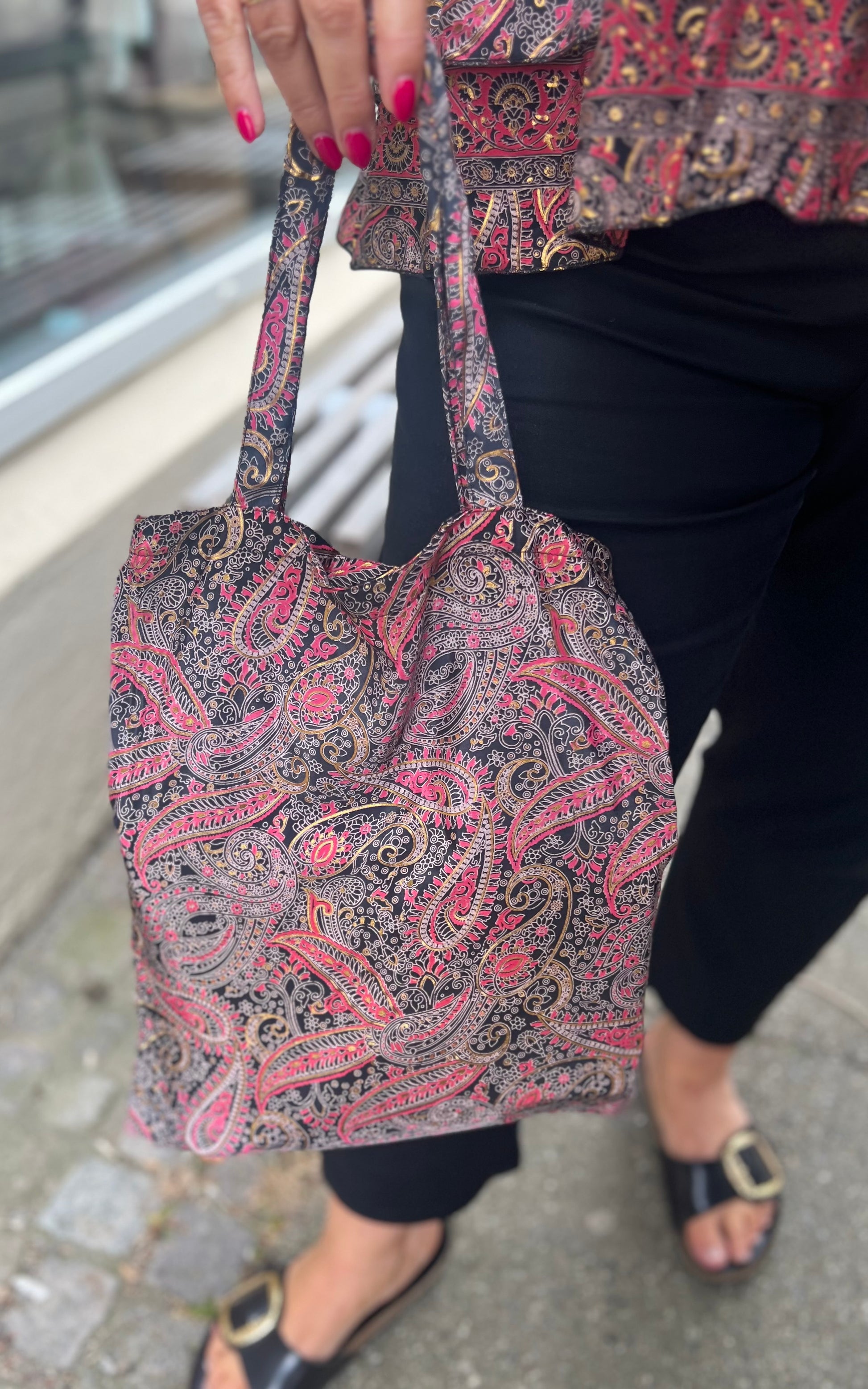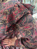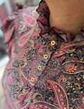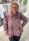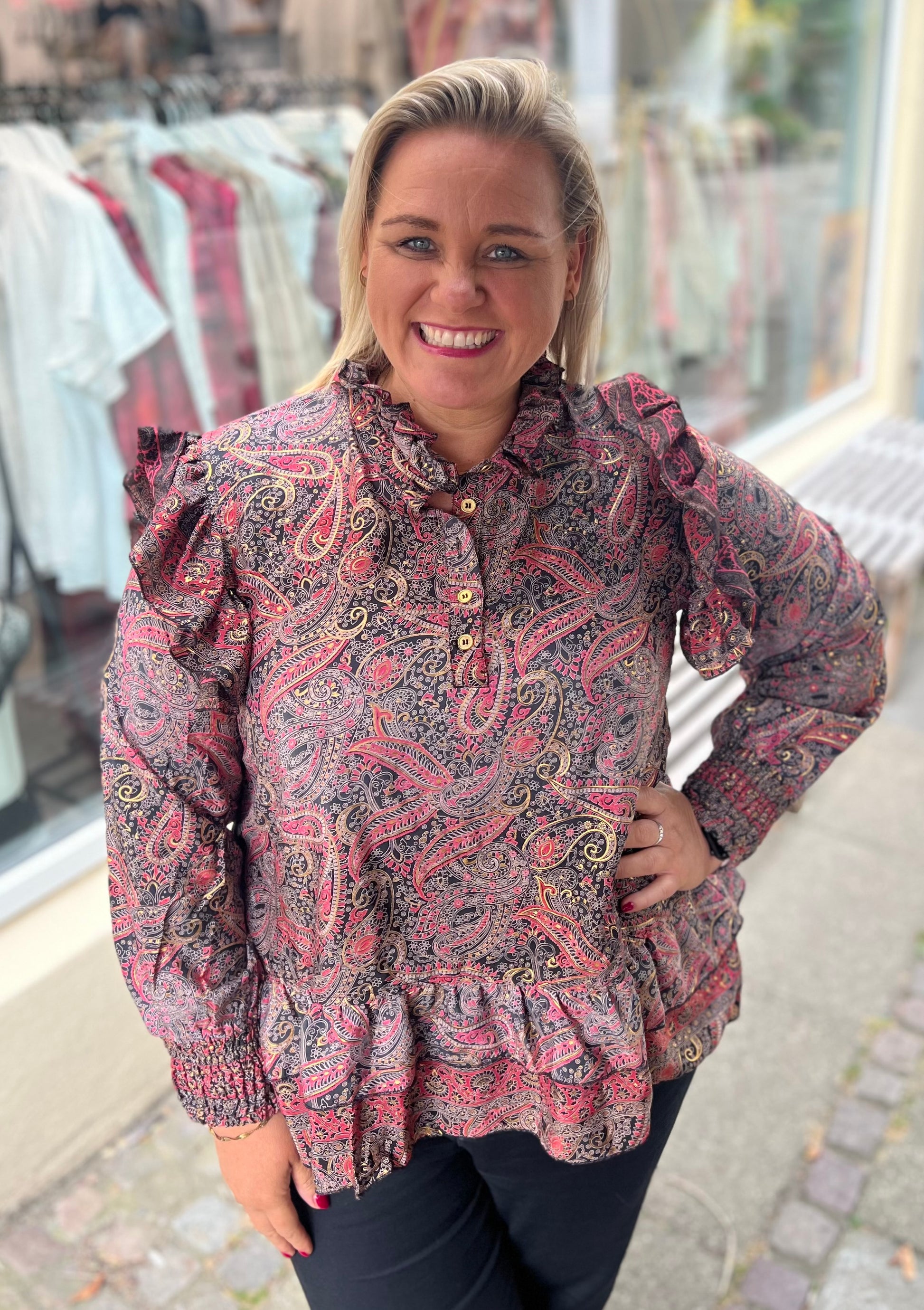 Smuk bluse med det fineste paisleyprint i varme farver og flotte gulddetaljer. Flæserne ved hals og skuldre giver et feminint udtryk, og den lille kant forneden fuldender looket.