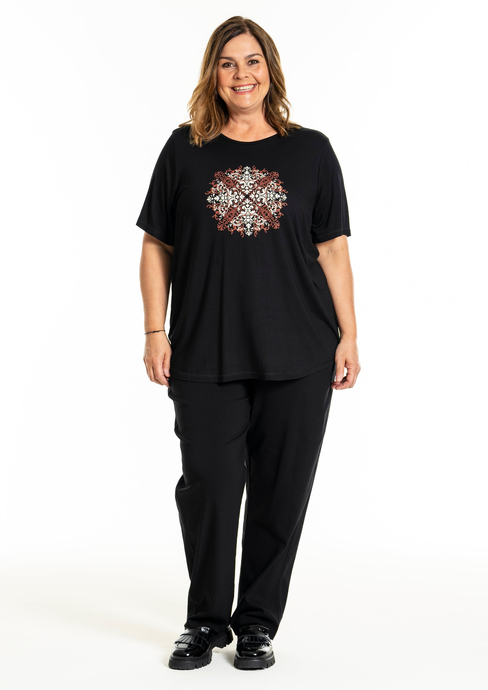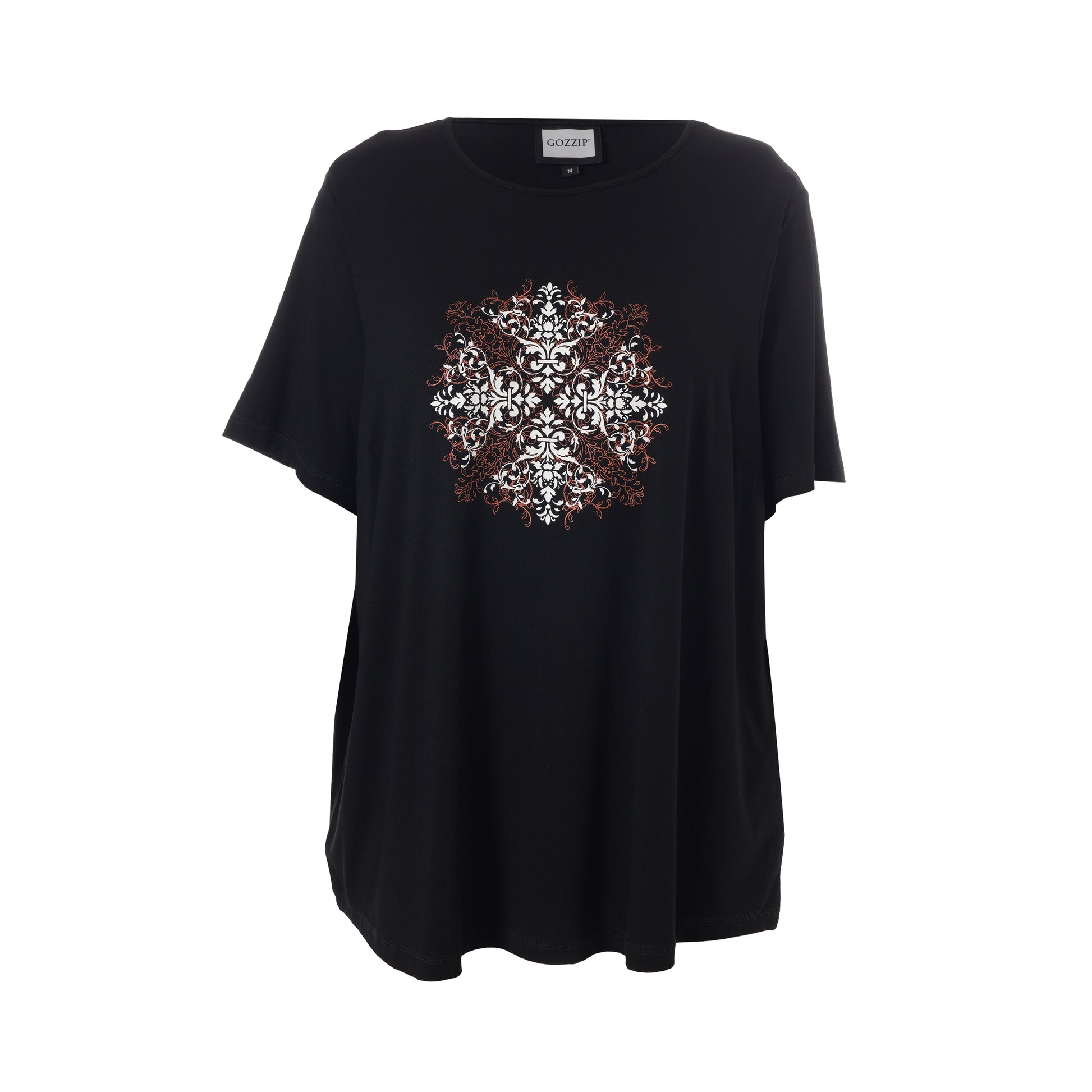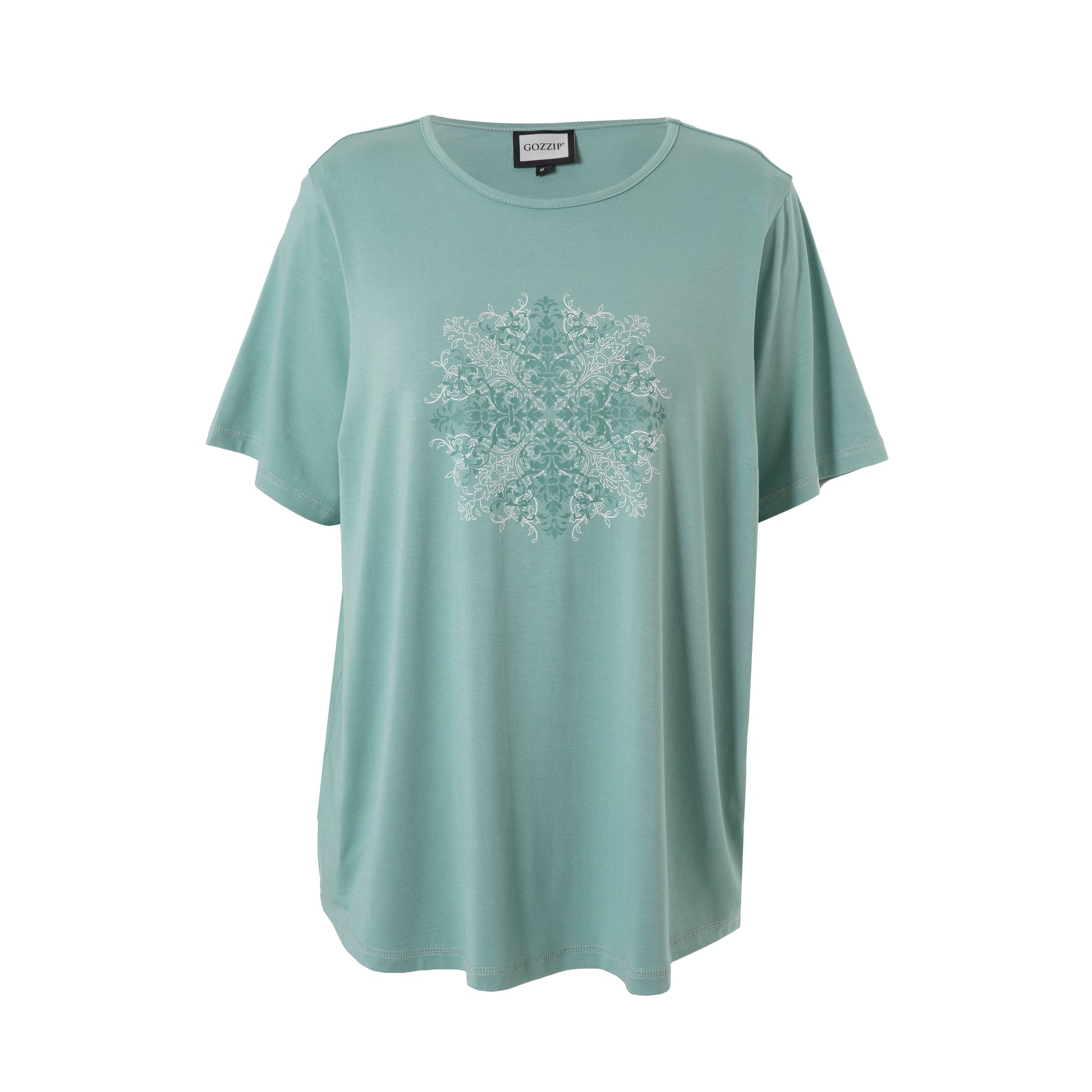 Denne T-shirt fra Gozzip kombinerer komfort og stil med et flot mønstret print på fronten, der tilføjer et unikt touch. Lavet i et blødt materiale med en afslappet pasform og korte ærmer, er den ideel til både hverdag og afslappede anledninger. Let at style med dine yndlingsbukser eller en nederdel.