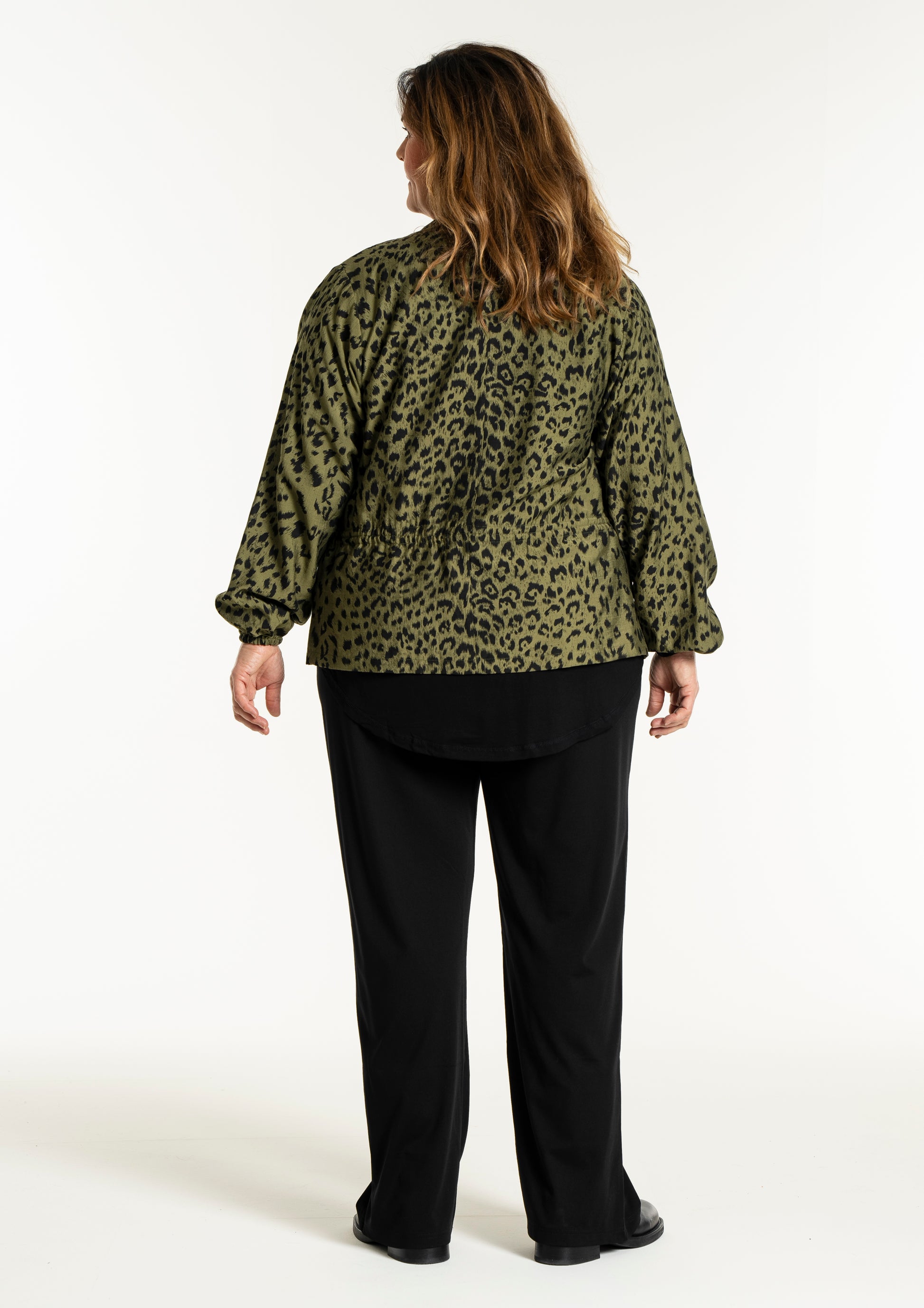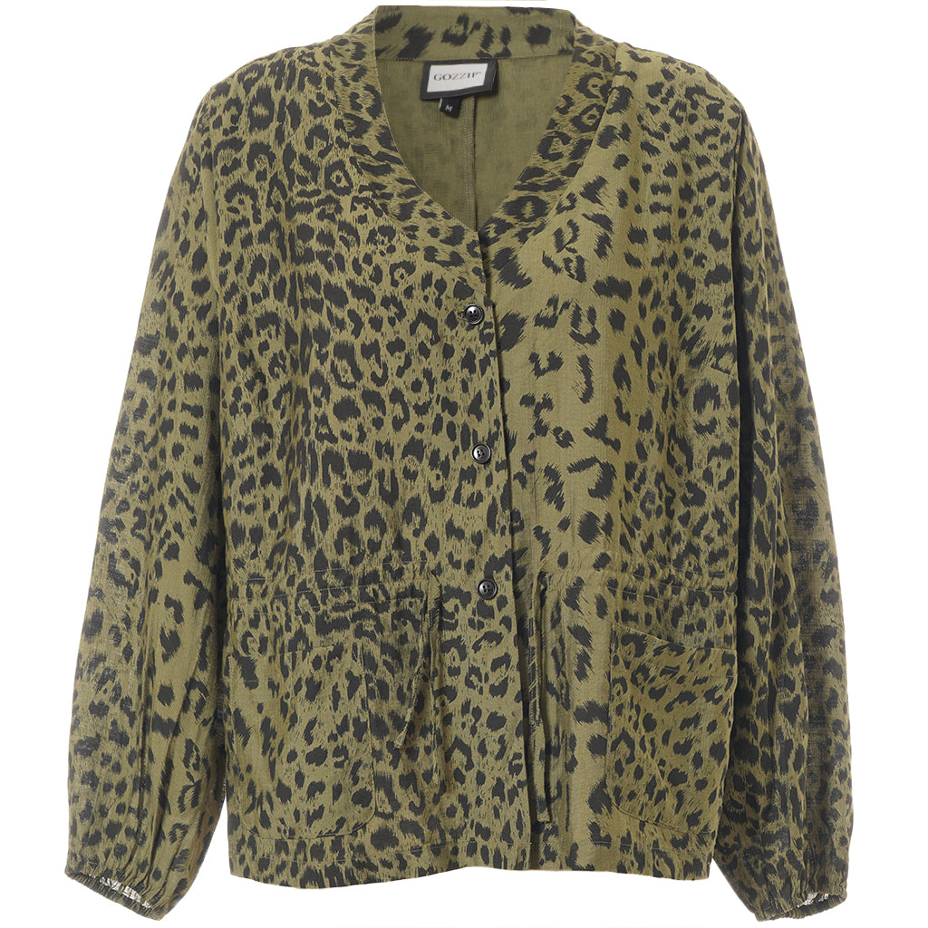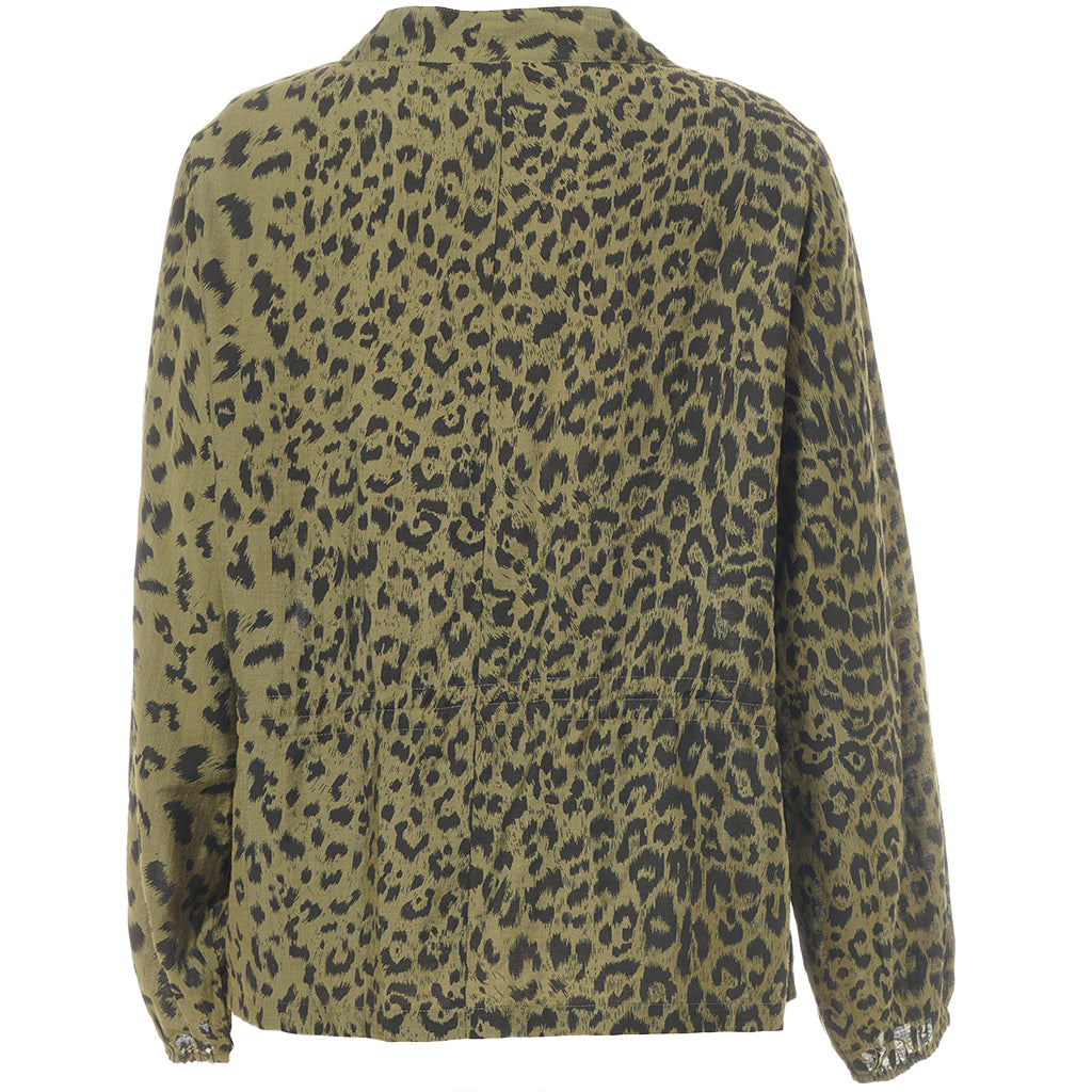 Stilfuld kort jakke med leopardprint i olivengrønne og sorte nuancer i en viskose-nylonblanding. Modellen har rummelig pasform og er designet med V-udskæring, knaplukning, store lommer foran og justerbart bindebælte i taljen. Ærmerne afsluttes med elastiske manchetter, der giver en let ballon-effekt.