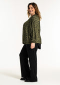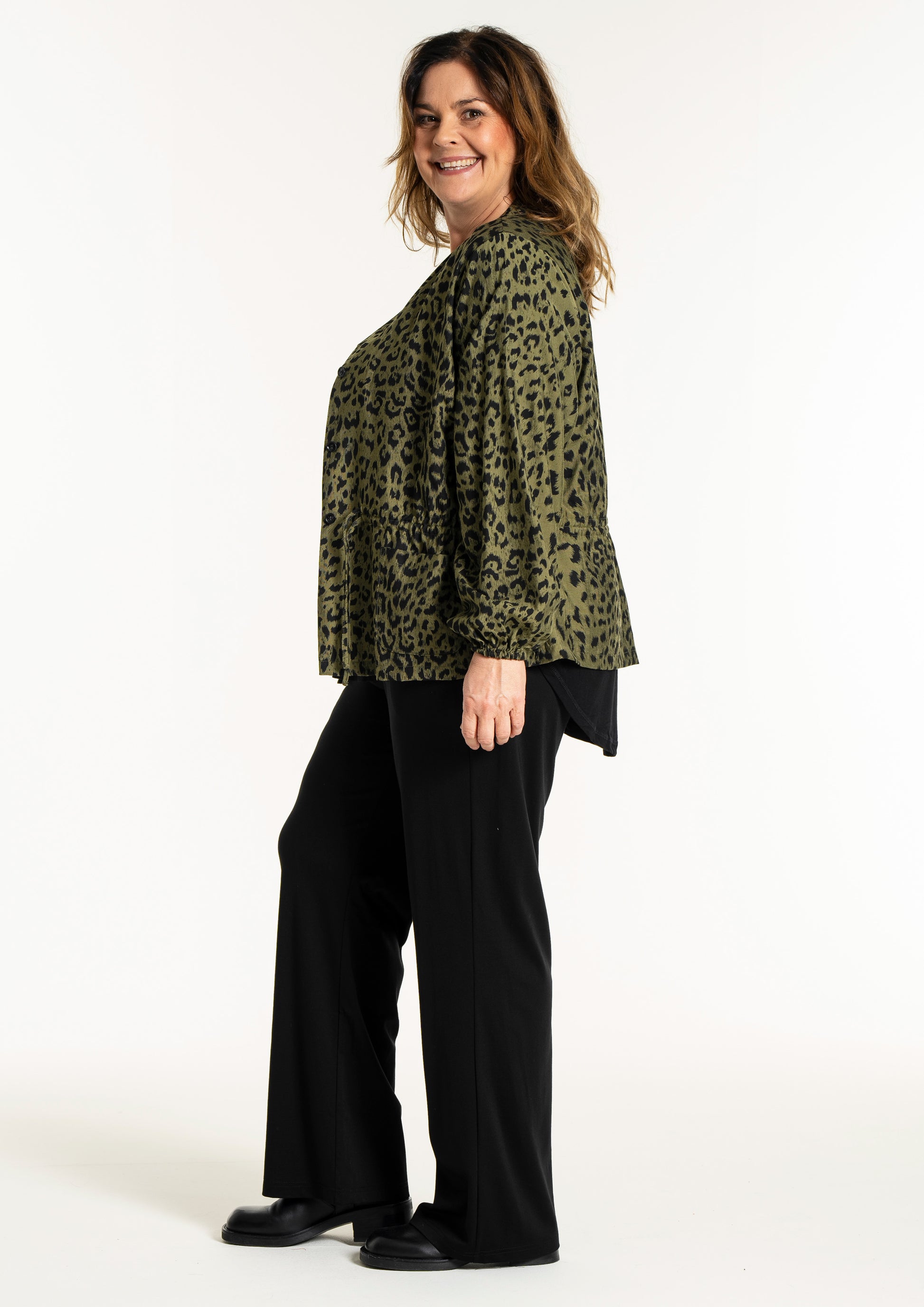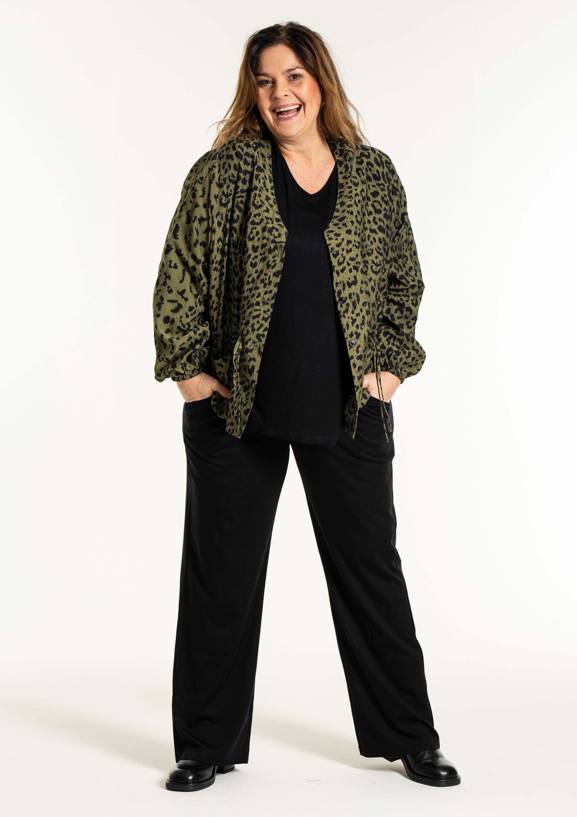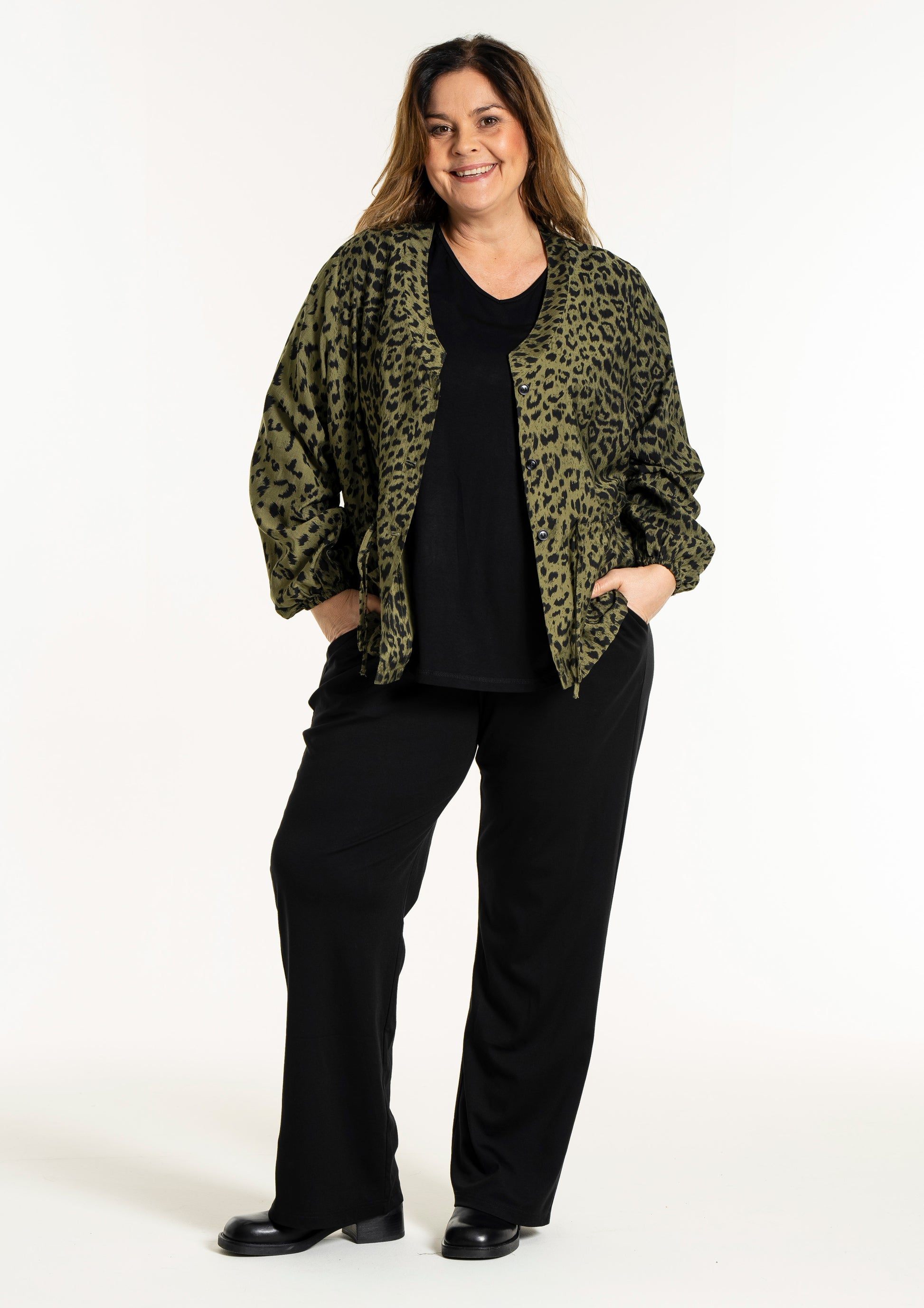 Stilfuld kort jakke med leopardprint i olivengrønne og sorte nuancer i en viskose-nylonblanding. Modellen har rummelig pasform og er designet med V-udskæring, knaplukning, store lommer foran og justerbart bindebælte i taljen. Ærmerne afsluttes med elastiske manchetter, der giver en let ballon-effekt.
