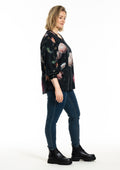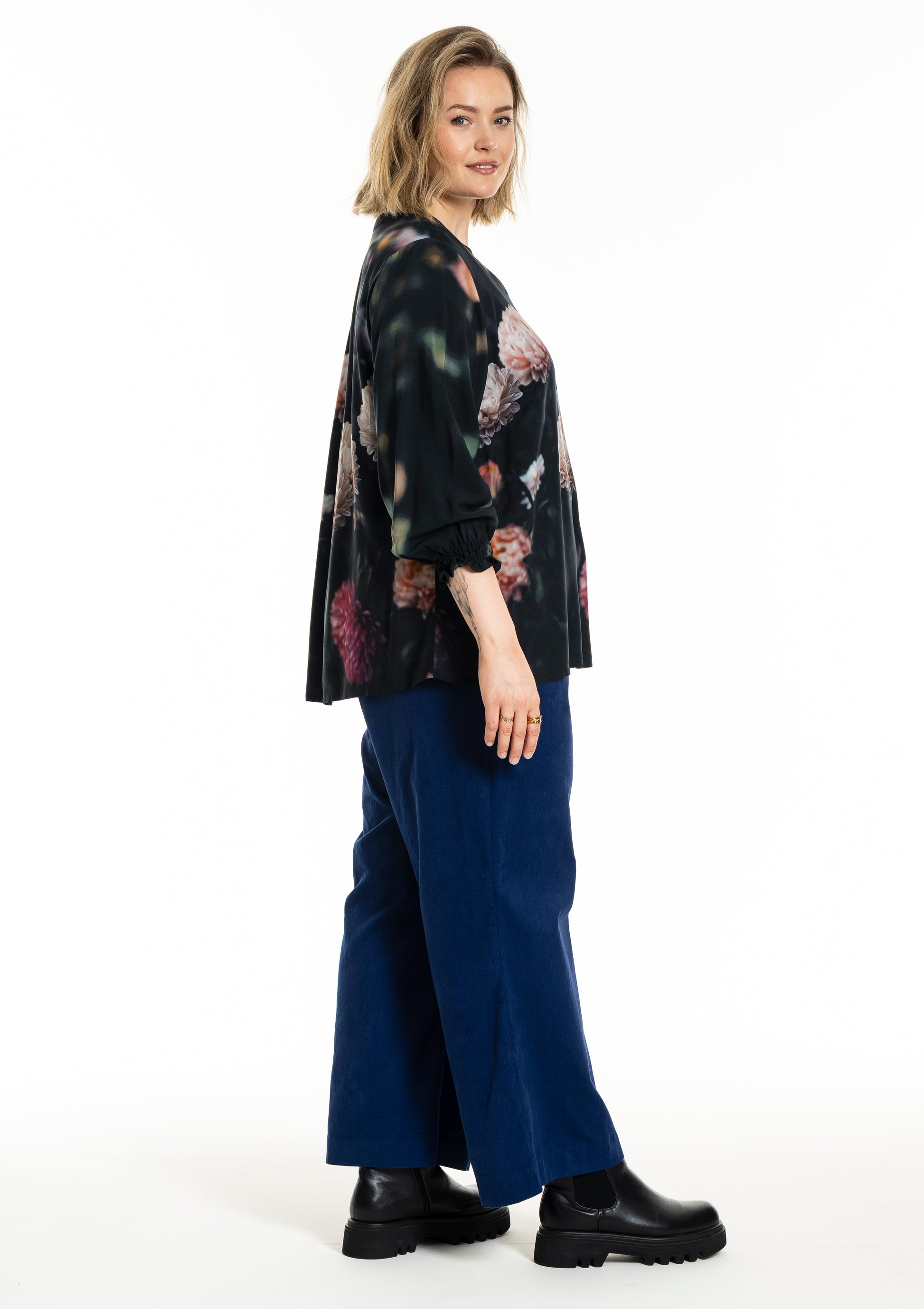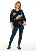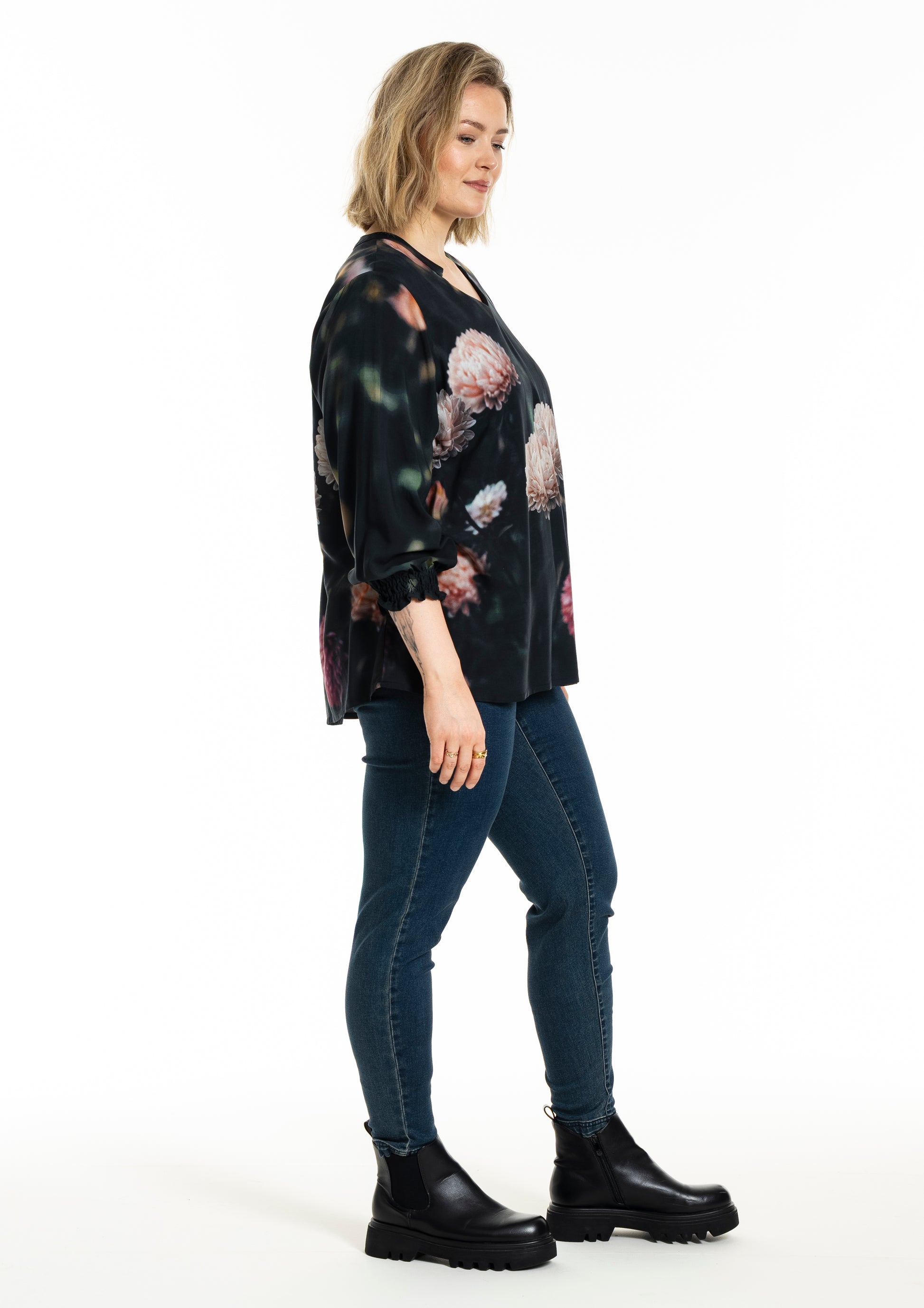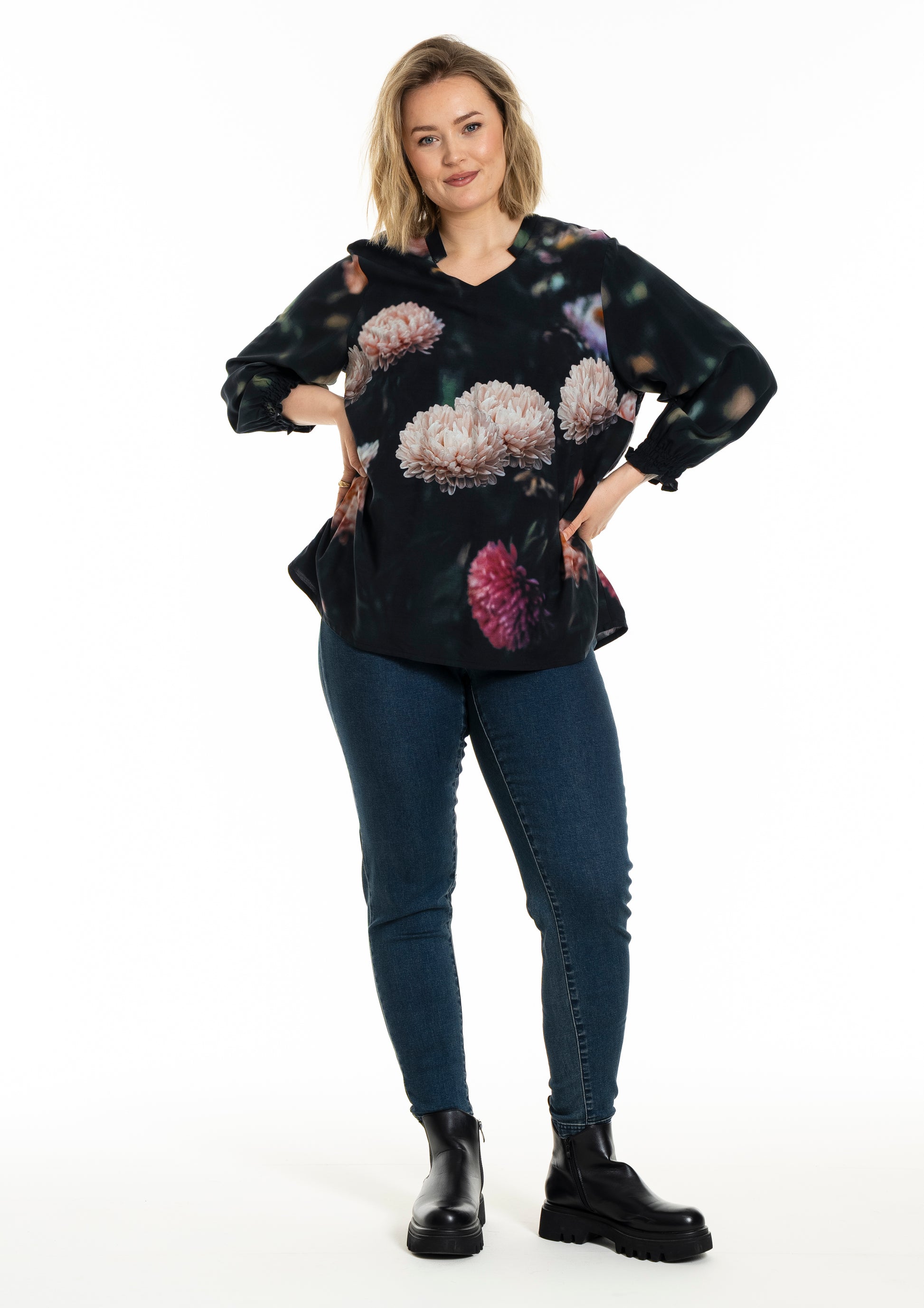 En bluse i 100% viskose med et blødt fald og et elegant peony-print i lyse nuancer. Modellen har en V-slidsudskæring foran og lange ærmer med manchetter, hvilket giver et feminint og afslappet udtryk. Den løse pasform gør blusen behagelig at bære og nem at style både til hverdag og festlige lejligheder.