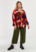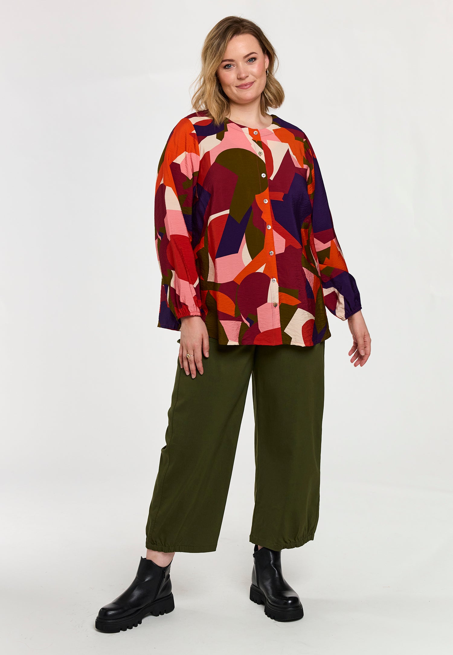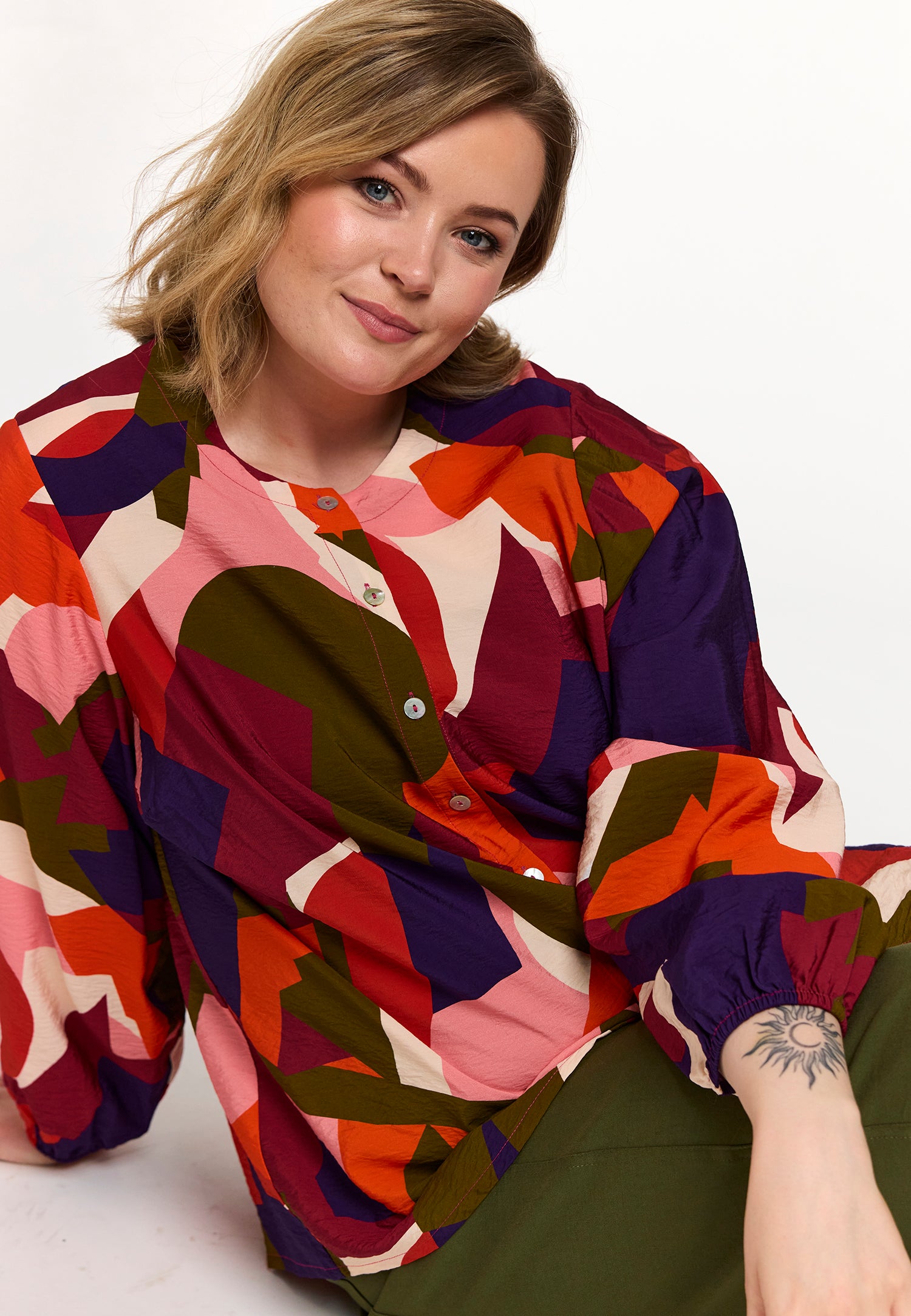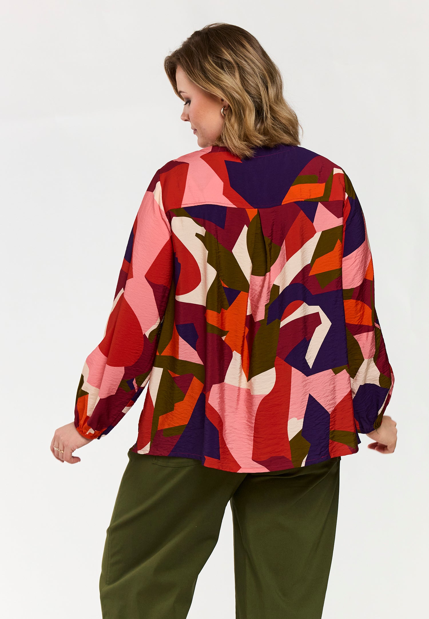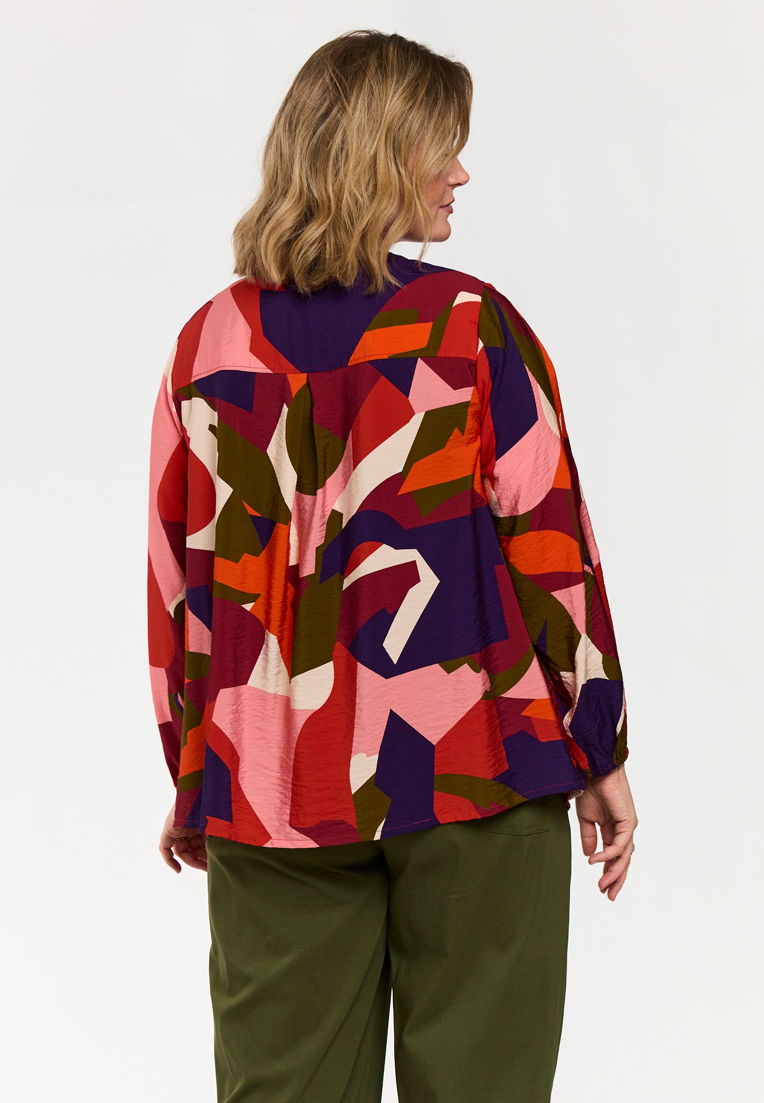 En let bluse i viskose/nylon med rund hals og gennemgående knaplukning. Silhuetten er løs og lige med et roligt fald, så blusen er nem at style både åben over en top eller lukket for et rent udtryk.