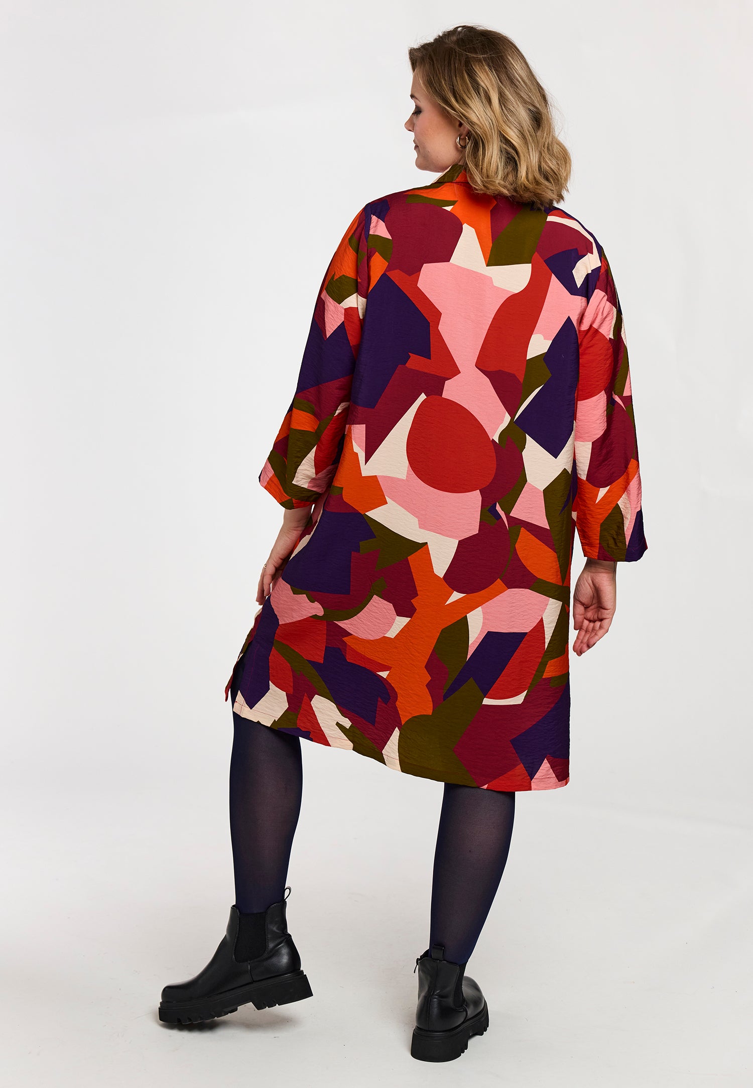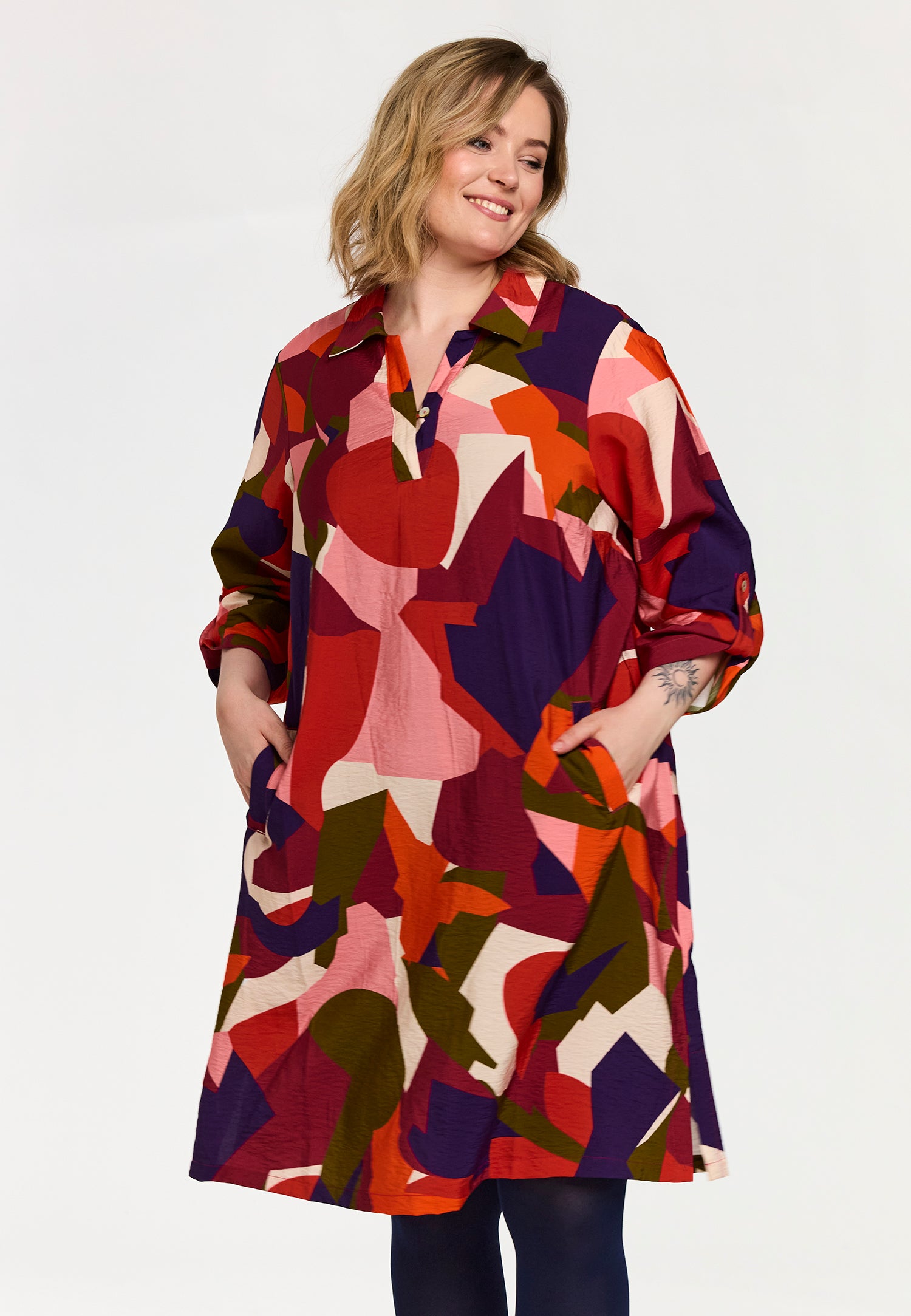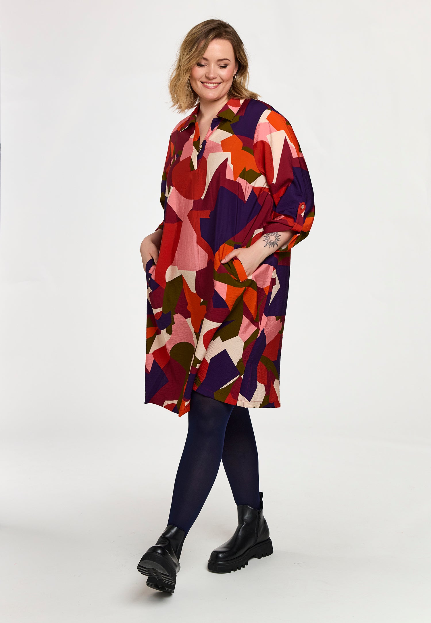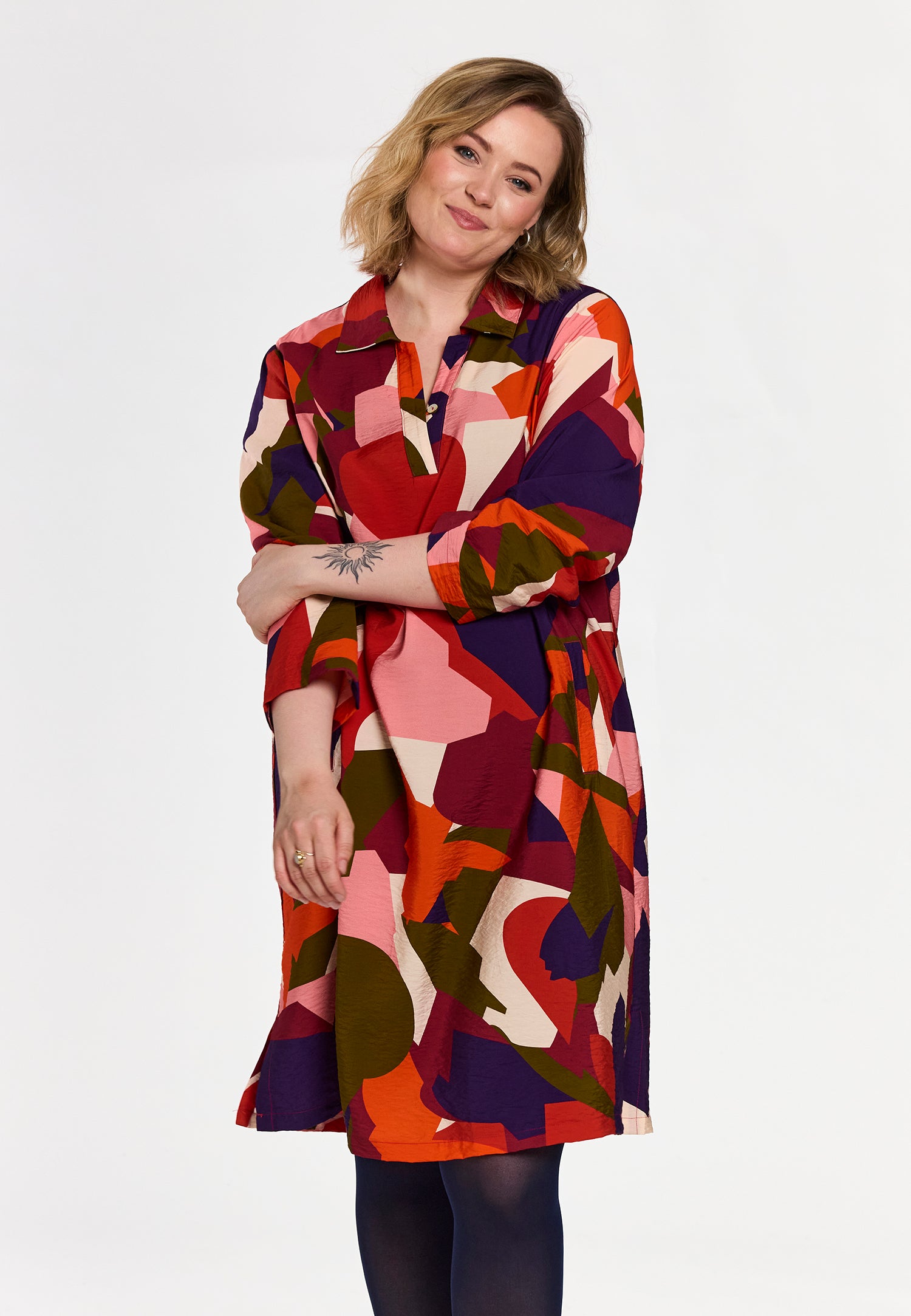 En luftig tunika i viskoseblanding med V-udskæring og gennemgående knaplukning. Snittet er løst og behageligt med 3/4-ærmer og et elegant fald, der gør modellen velegnet både som tunika og let kjole.
