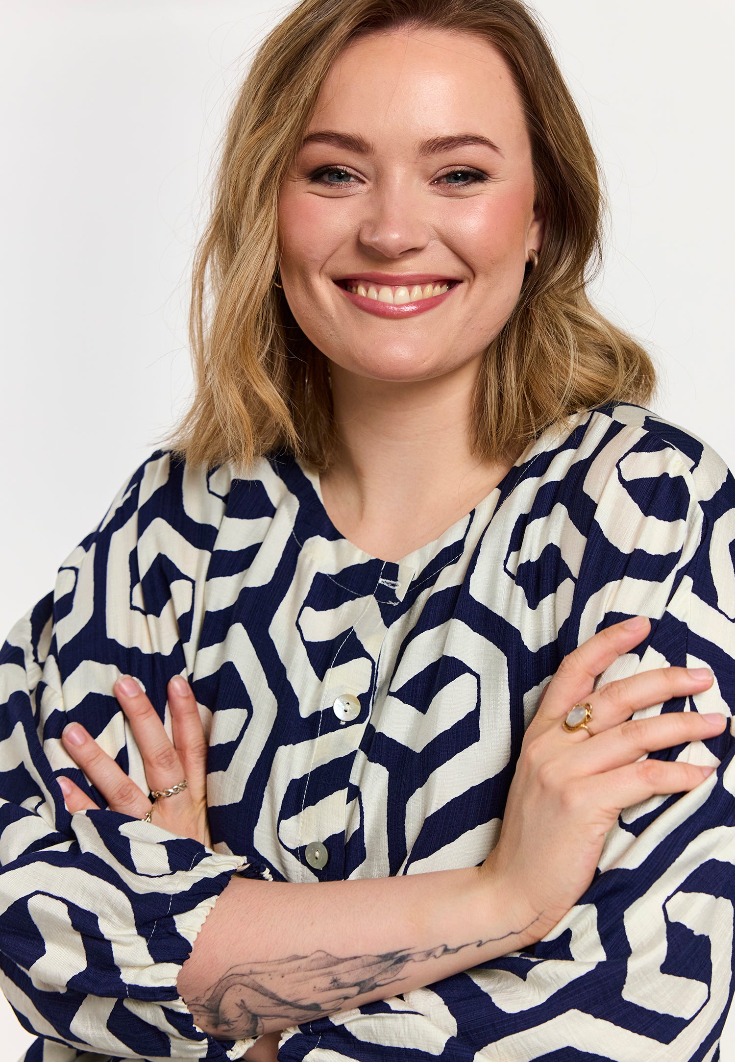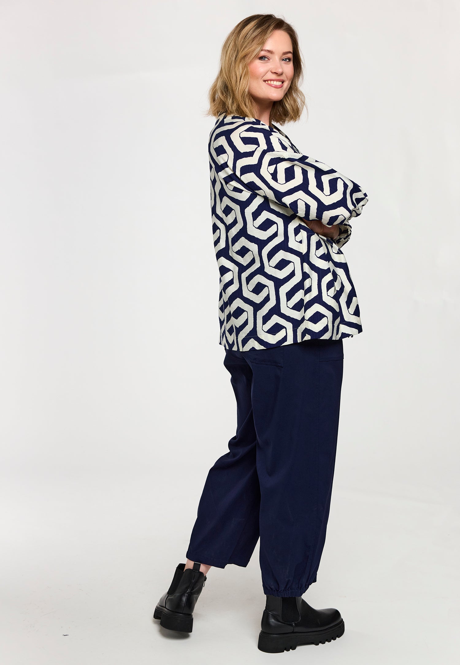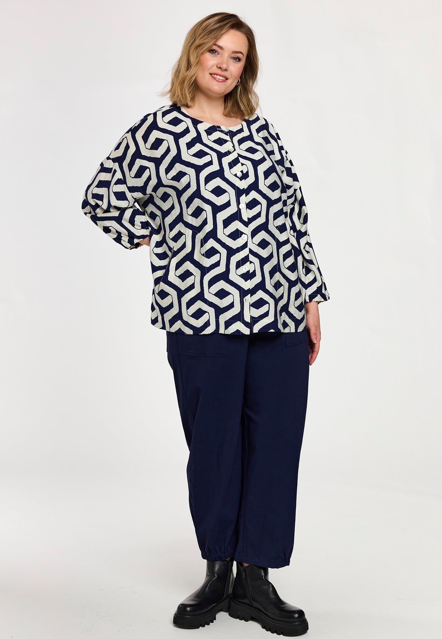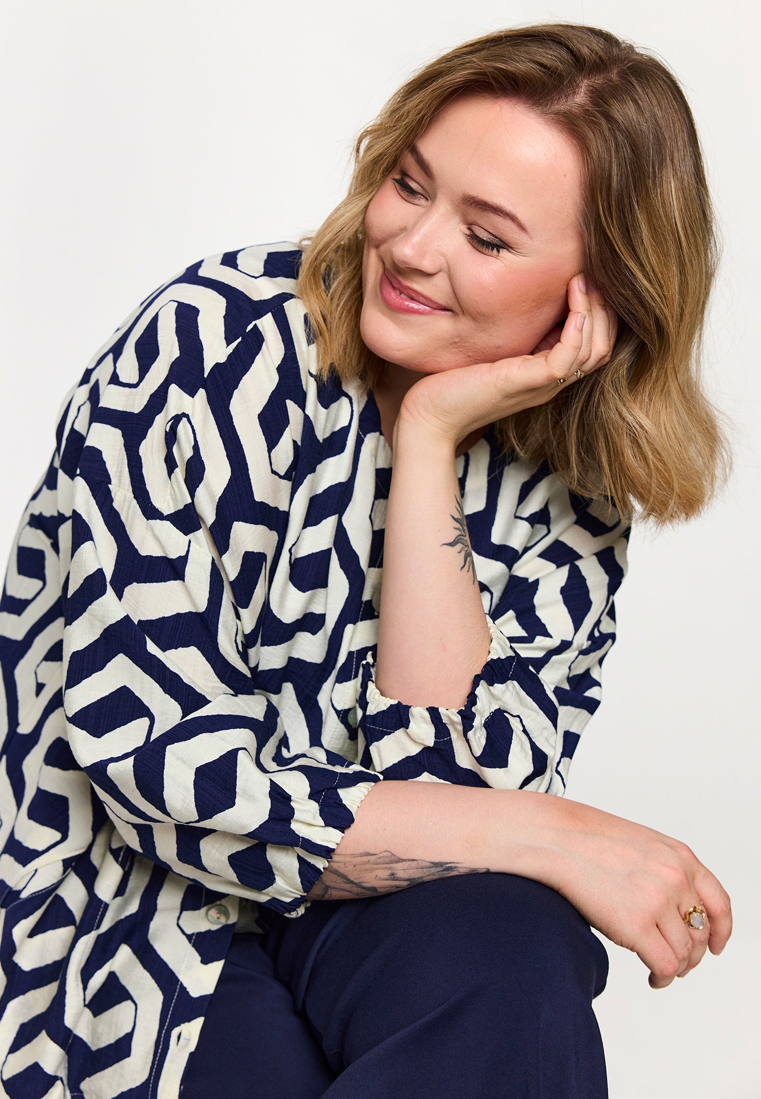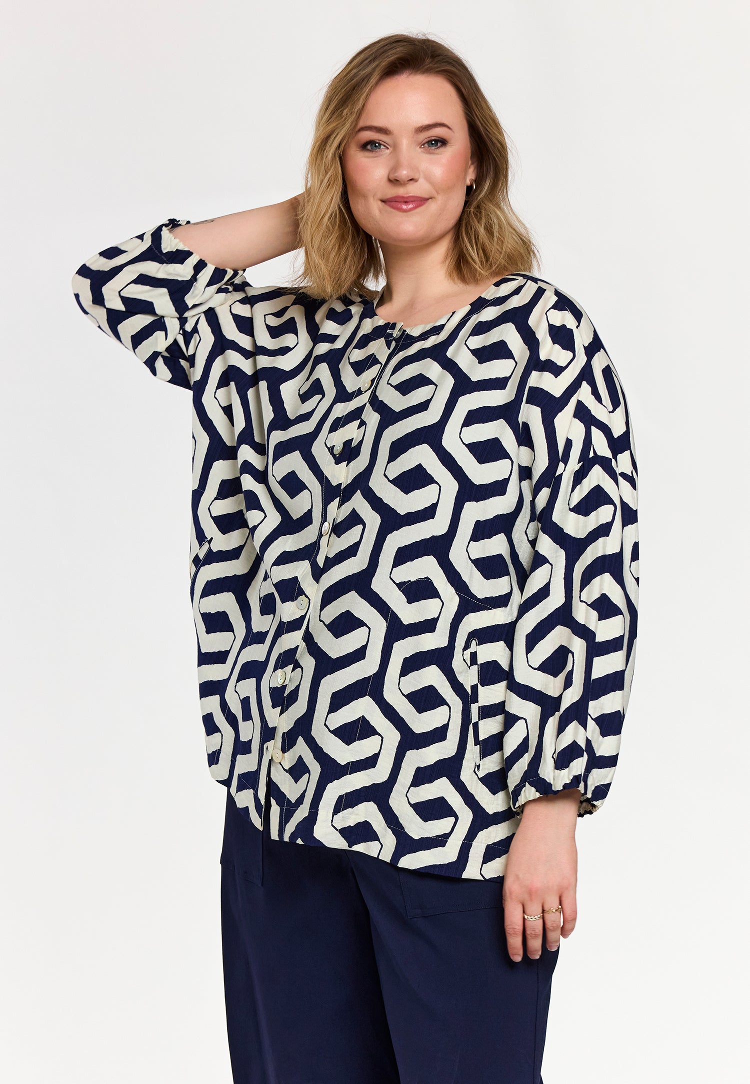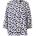 En let og moderne skjorte i en viskose-/nylonblanding med et markant grafisk print i blå og offwhite nuancer. Modellen har en afslappet pasform, som giver et stilrent og samtidig feminint udtryk. De 3/4-lange ærmer skaber et luftigt, behageligt look, der fungerer både alene og i lag-på-lag styling.