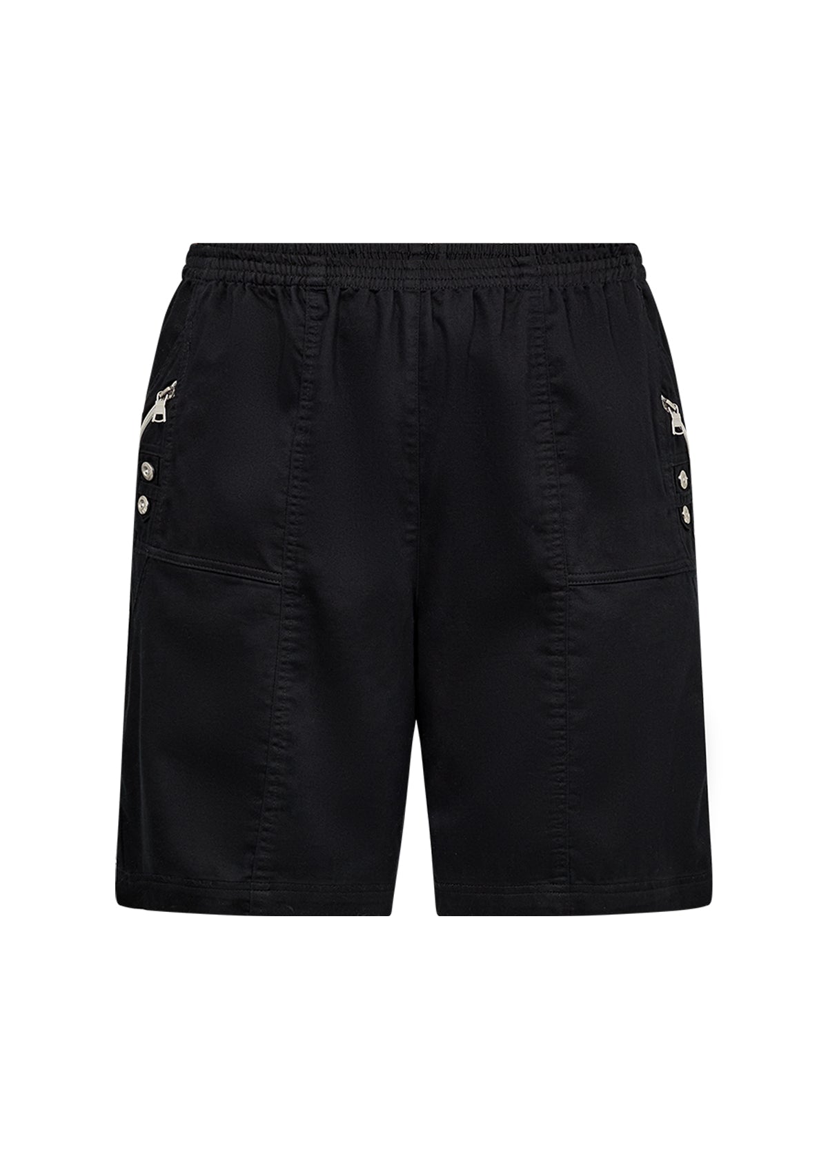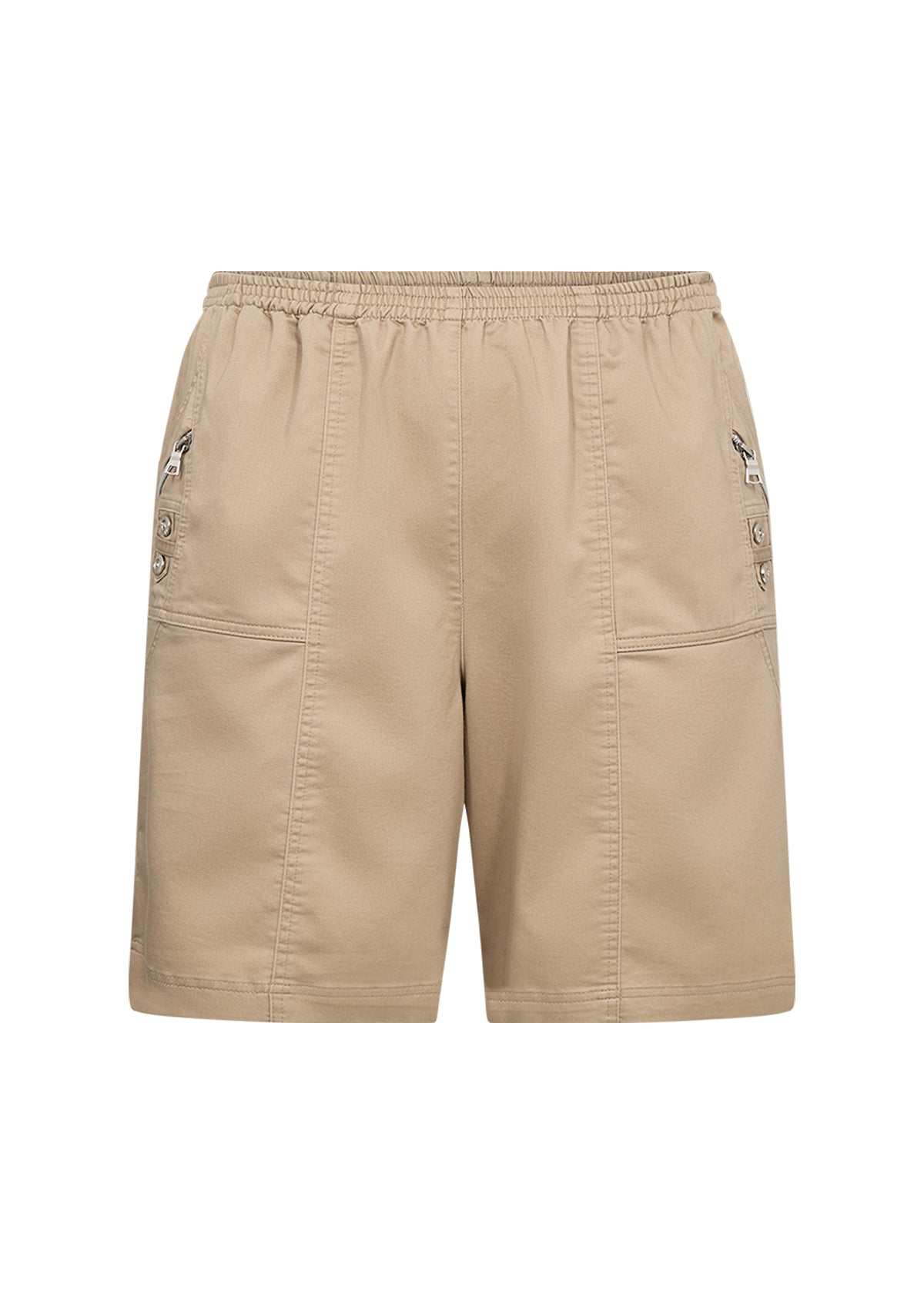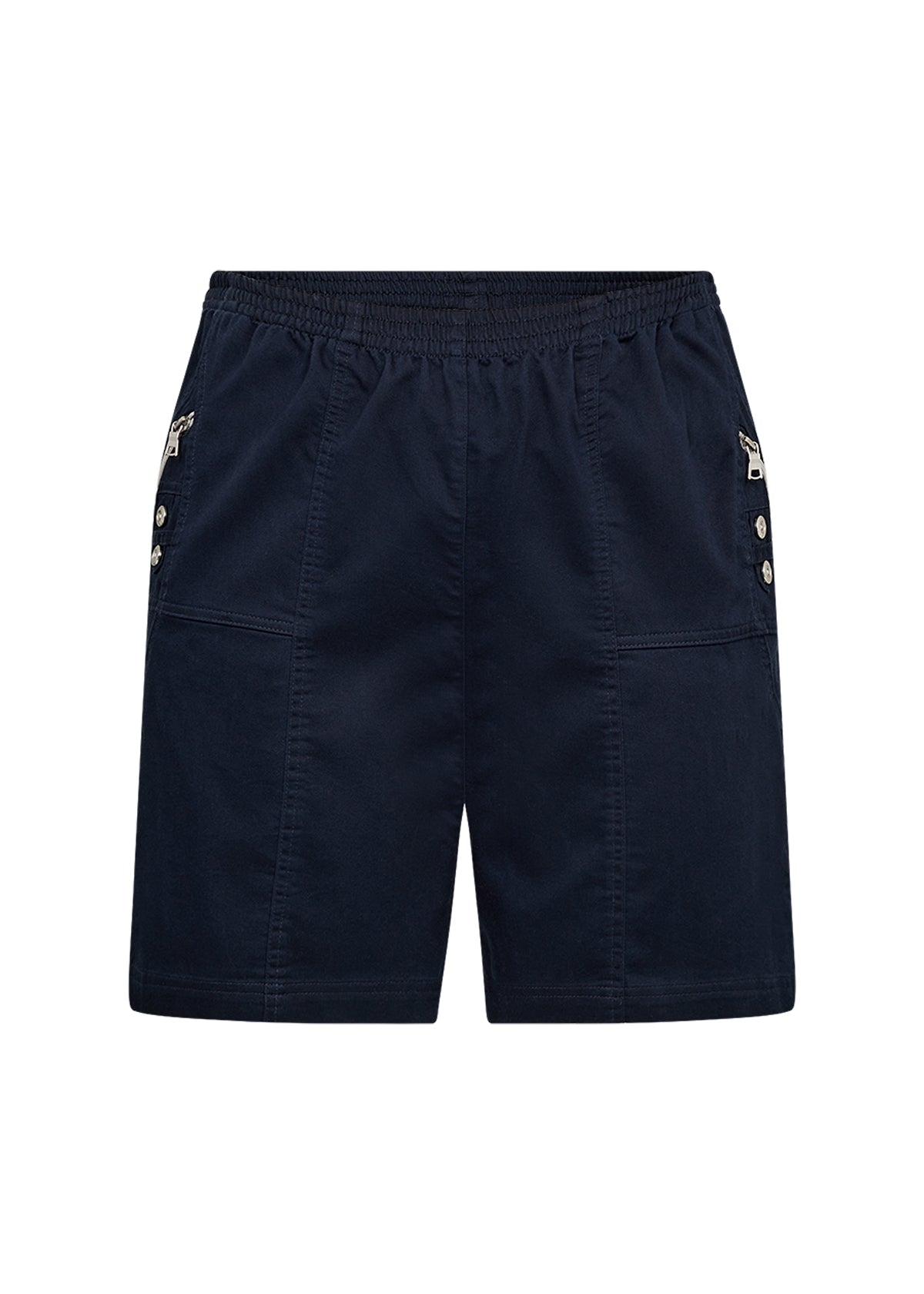 Super behagelige shorts med elastisk talje og praktiske lommer. Modellen har små pyntelynlåse og dekorative knapper i siden, som giver et sporty og feminint udtryk. Kommer i flere flotte farver og er lavet i en blød og let bomuldsblanding, der er skøn på varme dage.