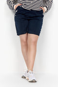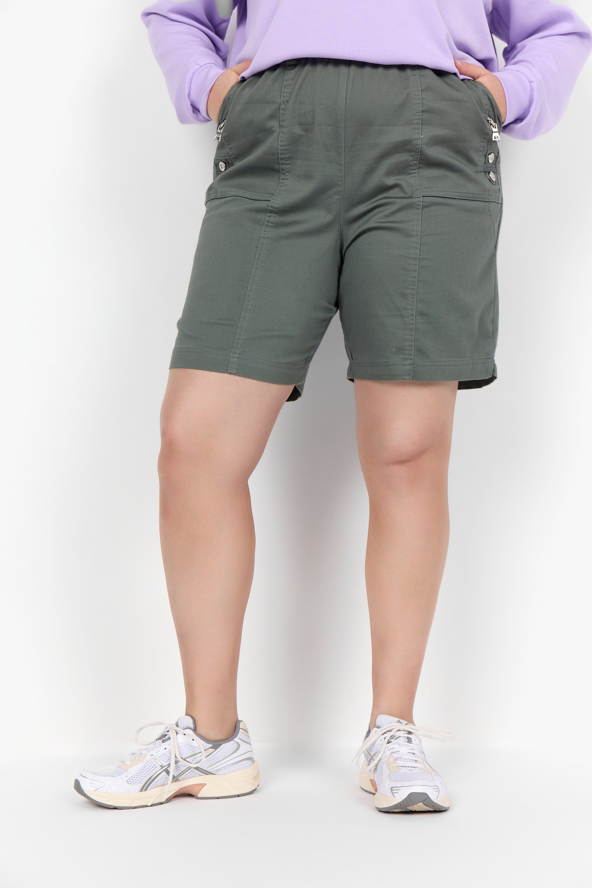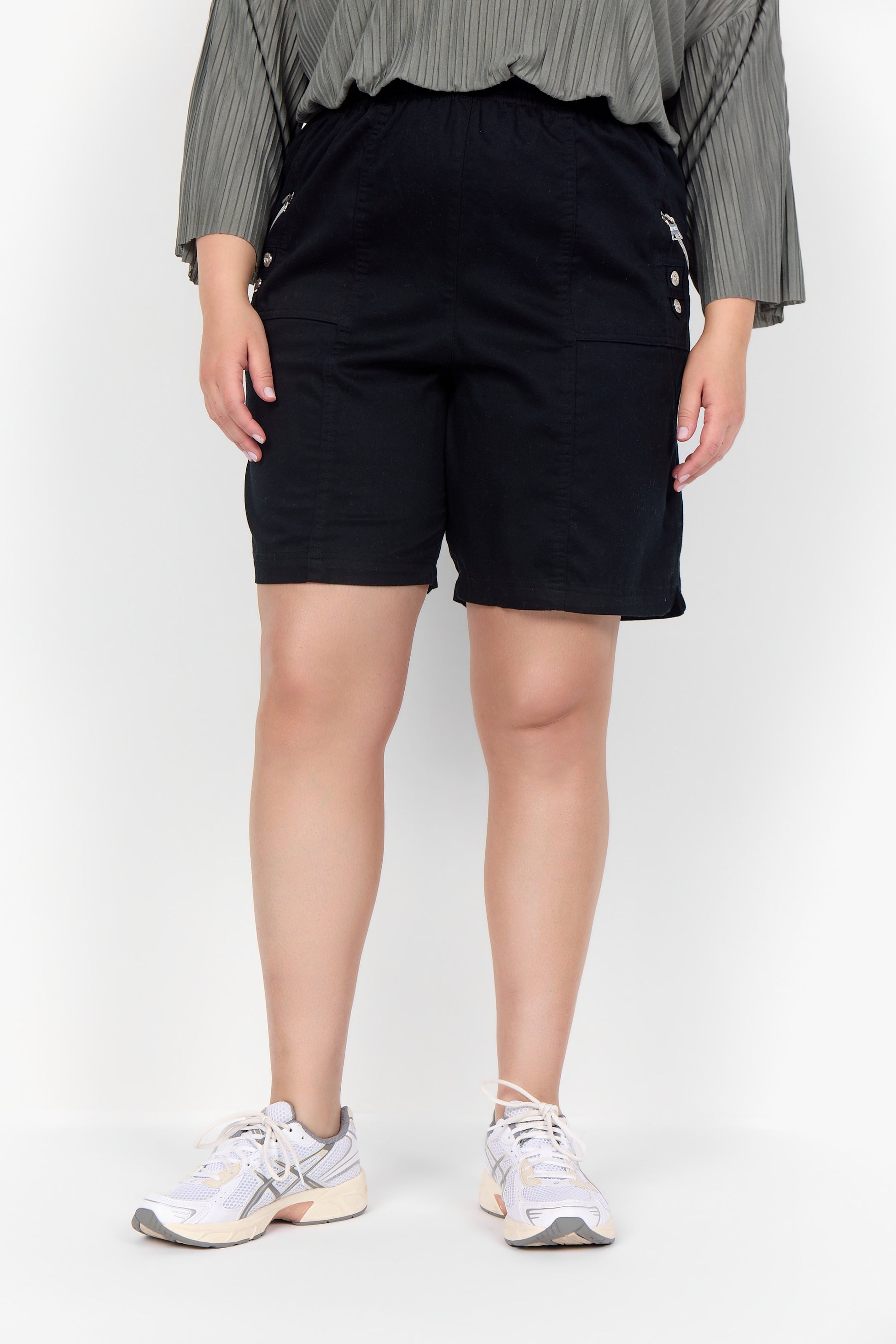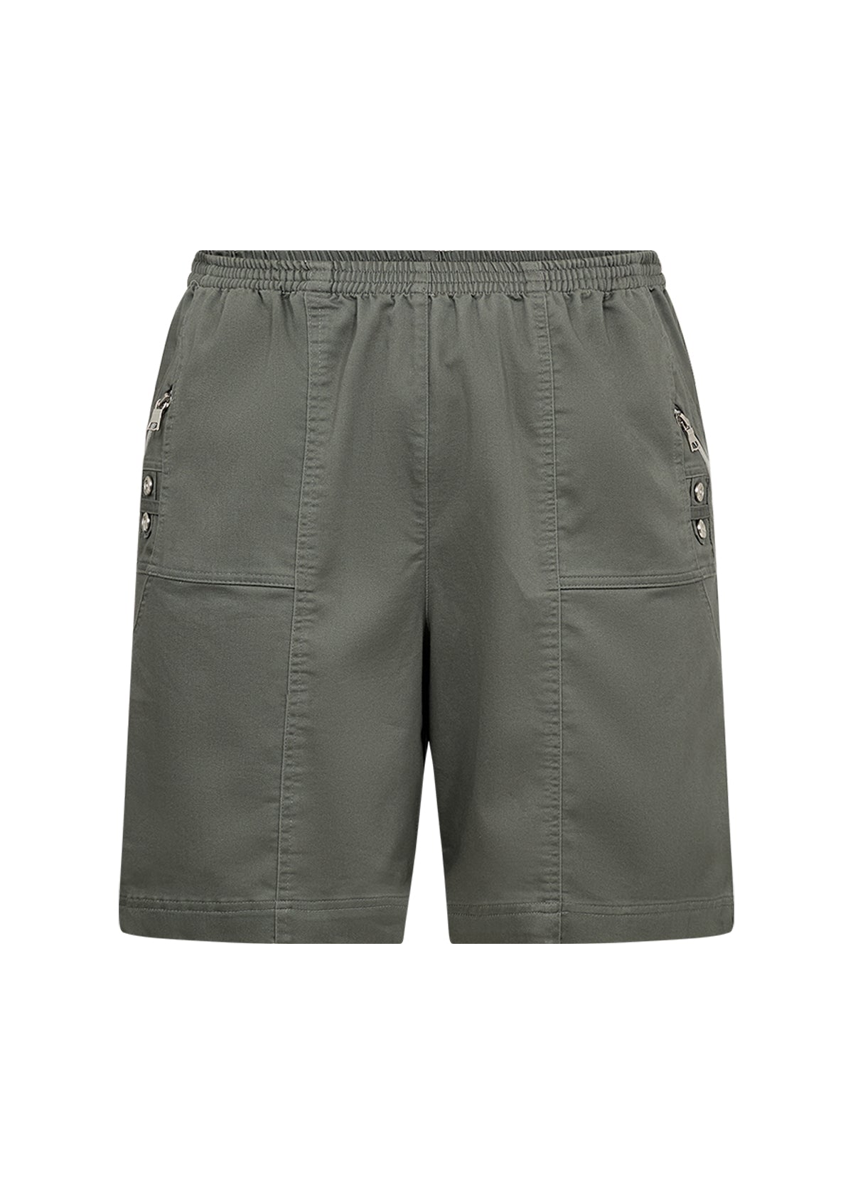 Super behagelige shorts med elastisk talje og praktiske lommer. Modellen har små pyntelynlåse og dekorative knapper i siden, som giver et sporty og feminint udtryk. Kommer i flere flotte farver og er lavet i en blød og let bomuldsblanding, der er skøn på varme dage.