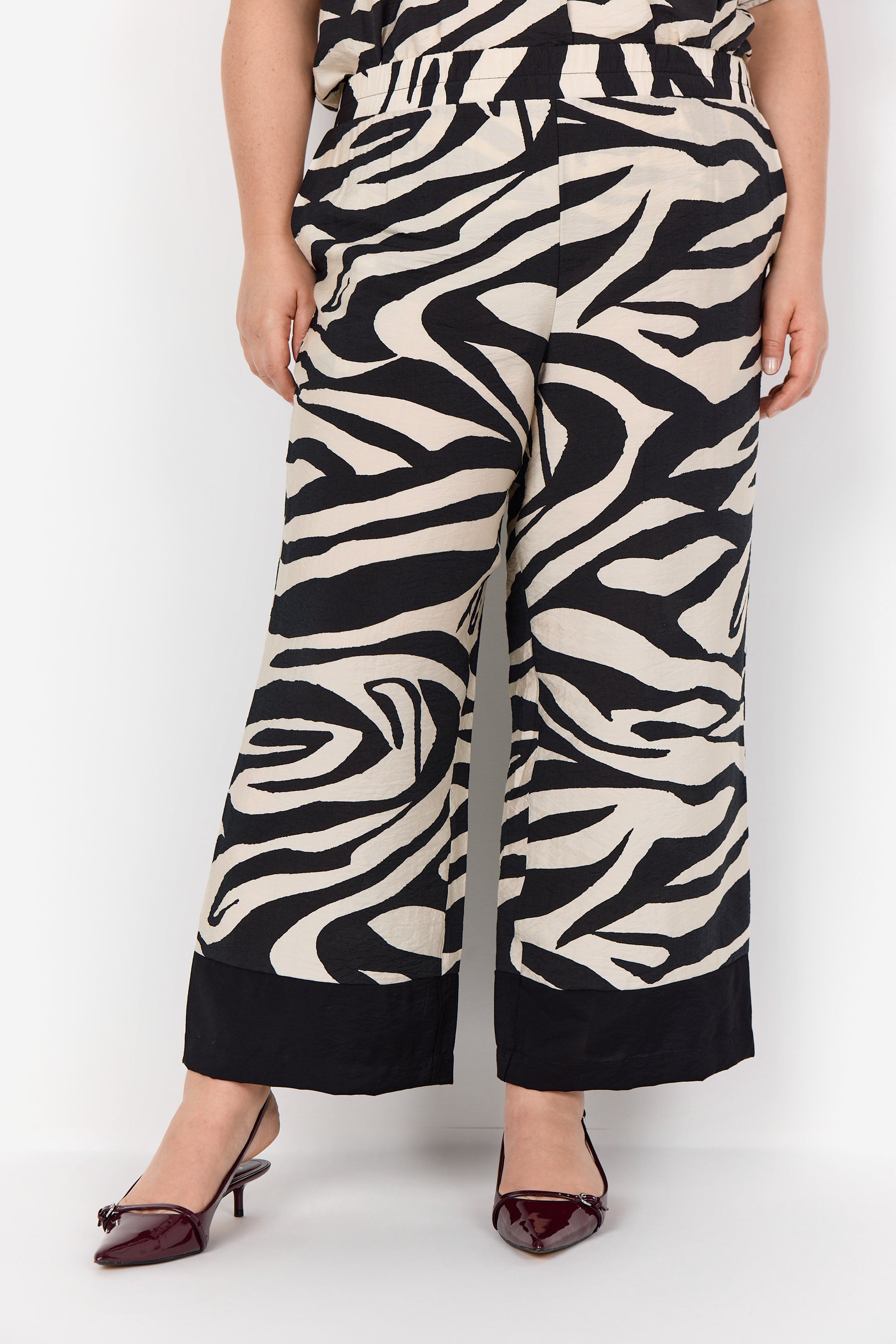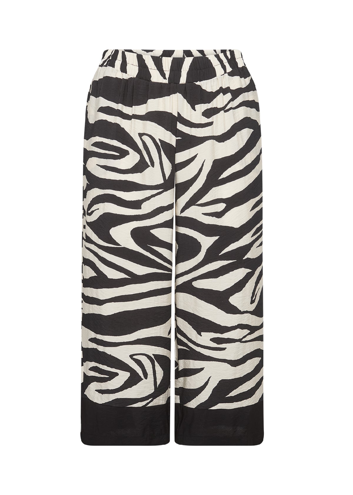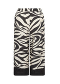 Lækre, brede bukser i sort og råhvidt zebra-print. Modellen har elastik bagpå i taljen og sidder behageligt med let struktur i stoffet. De lige ben afsluttes med en sort kant forneden, som giver buksen et ekstra lækkert finish. Perfekt sammen med den matchende bluse for et cool og gennemført look.