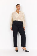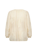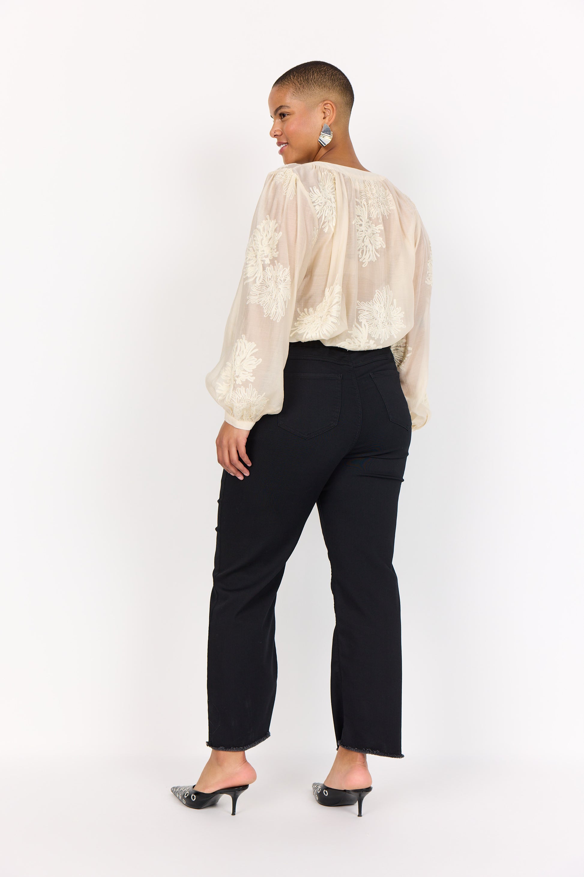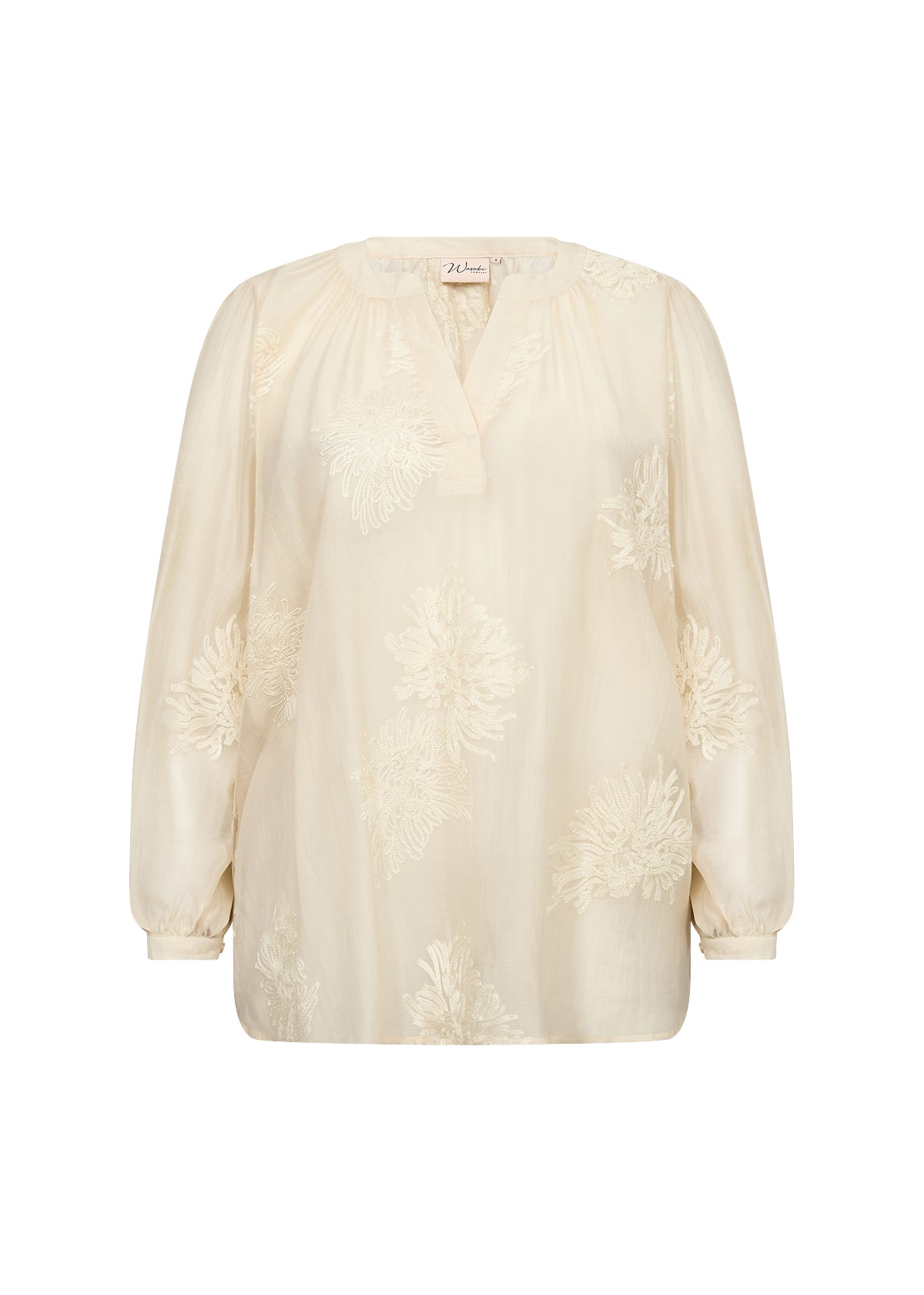 Blusen fremstillet af 75 % viskose og 25 % nylon. Den har et elegant blomsterbroderi, en diskret v-udskæring og manchetter. Sæt den sammen med skræddersyede bukser eller en nederdel for et poleret look.