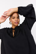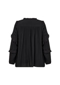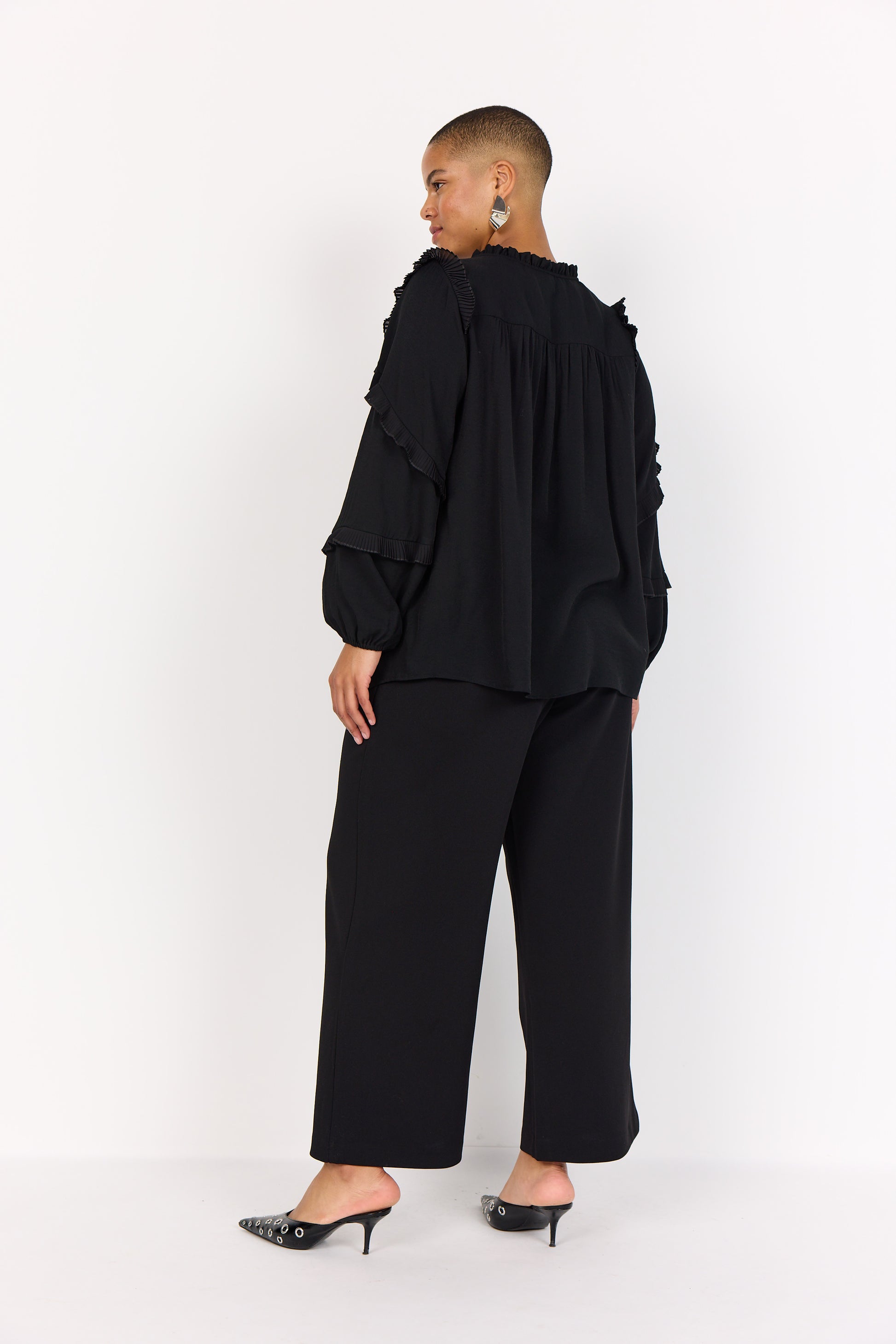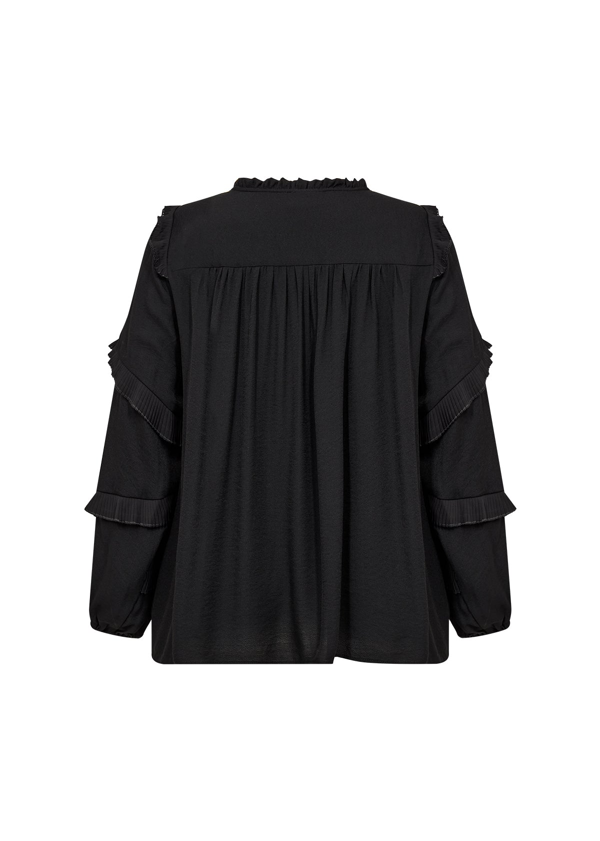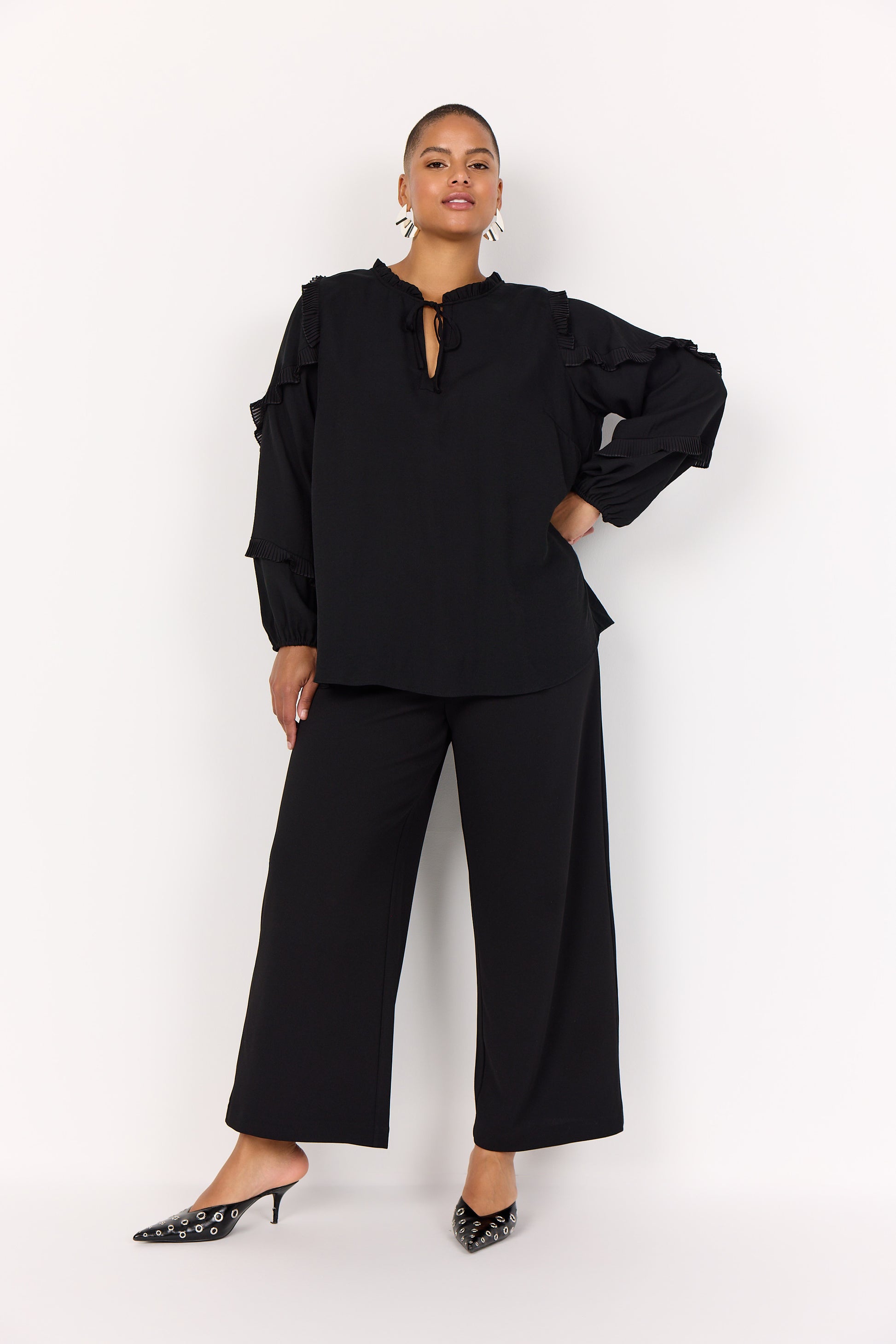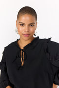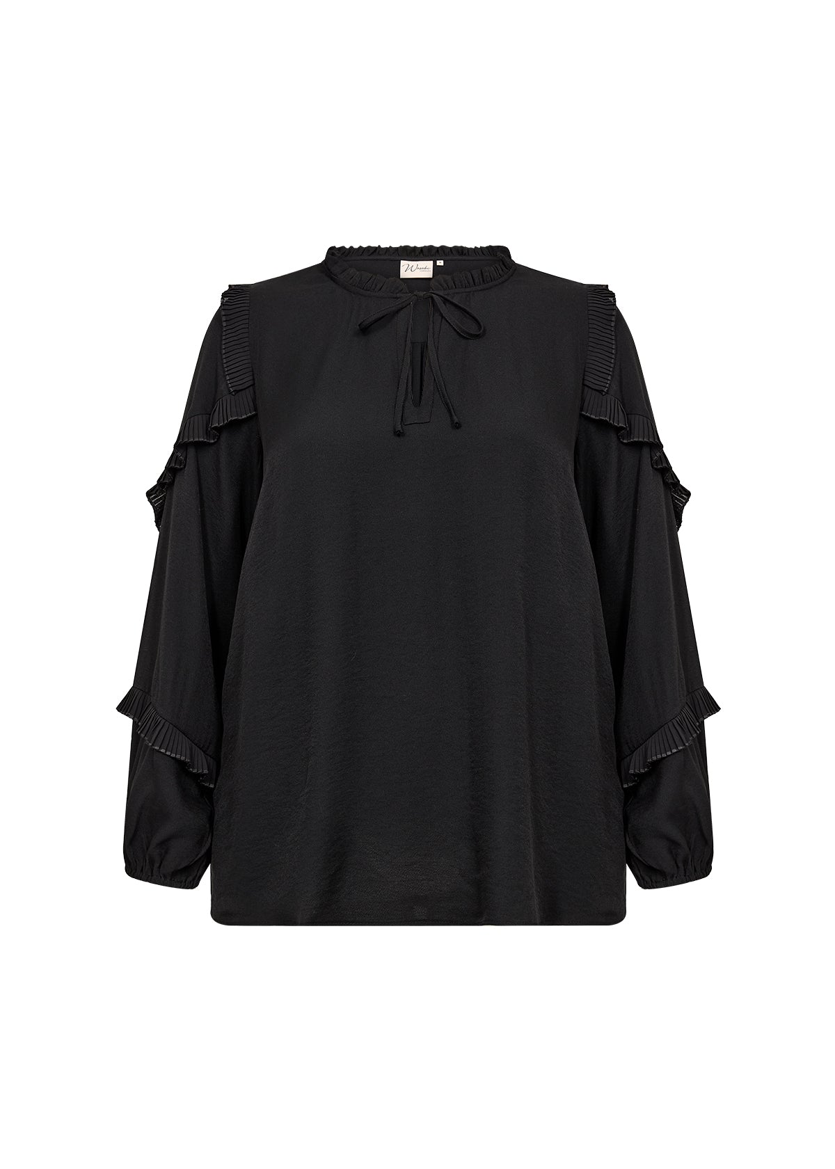 Blusen fremstillet af 85 % LENZING™ ECOVERO™-viskose og 15 % nylon. Denne elegante bluse har plisserede flæsedetaljer langs ærmerne, et bindebånd i nakken, en diskret krave og en afslappet pasform. Sæt den sammen med skræddersyede bukser for et sofistikeret look eller jeans for en cool, afslappet stil.