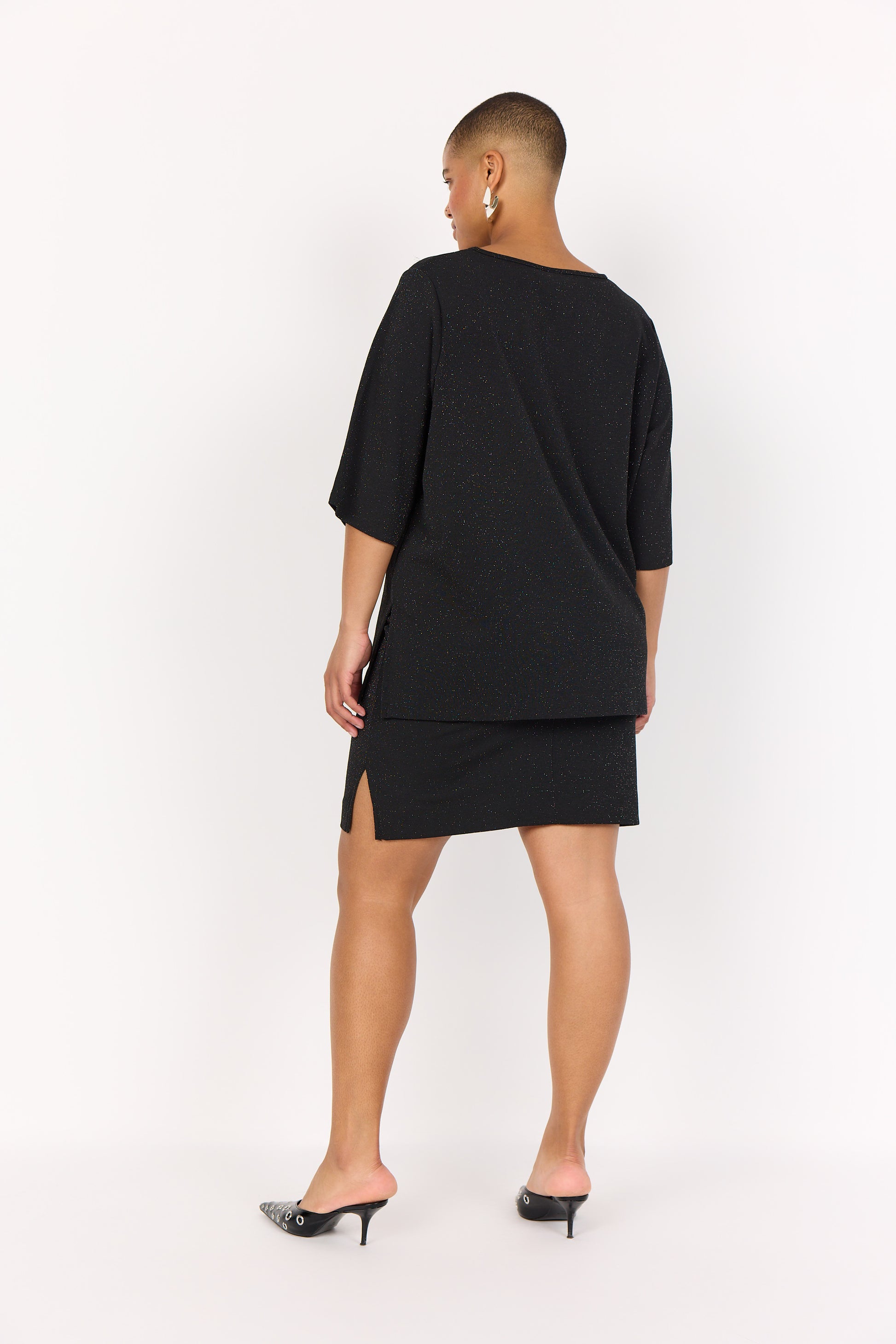 nederdel fremstillet af 50% LENZING™ ECOVERO™-viskose, 42% genbrugspolyester, 5% metal, 3% elastan. Denne nederdel har en slank linning, en slids og et subtilt glimmer. Sæt den sammen med en tætsiddende top og høje hæle for et sofistikeret look.