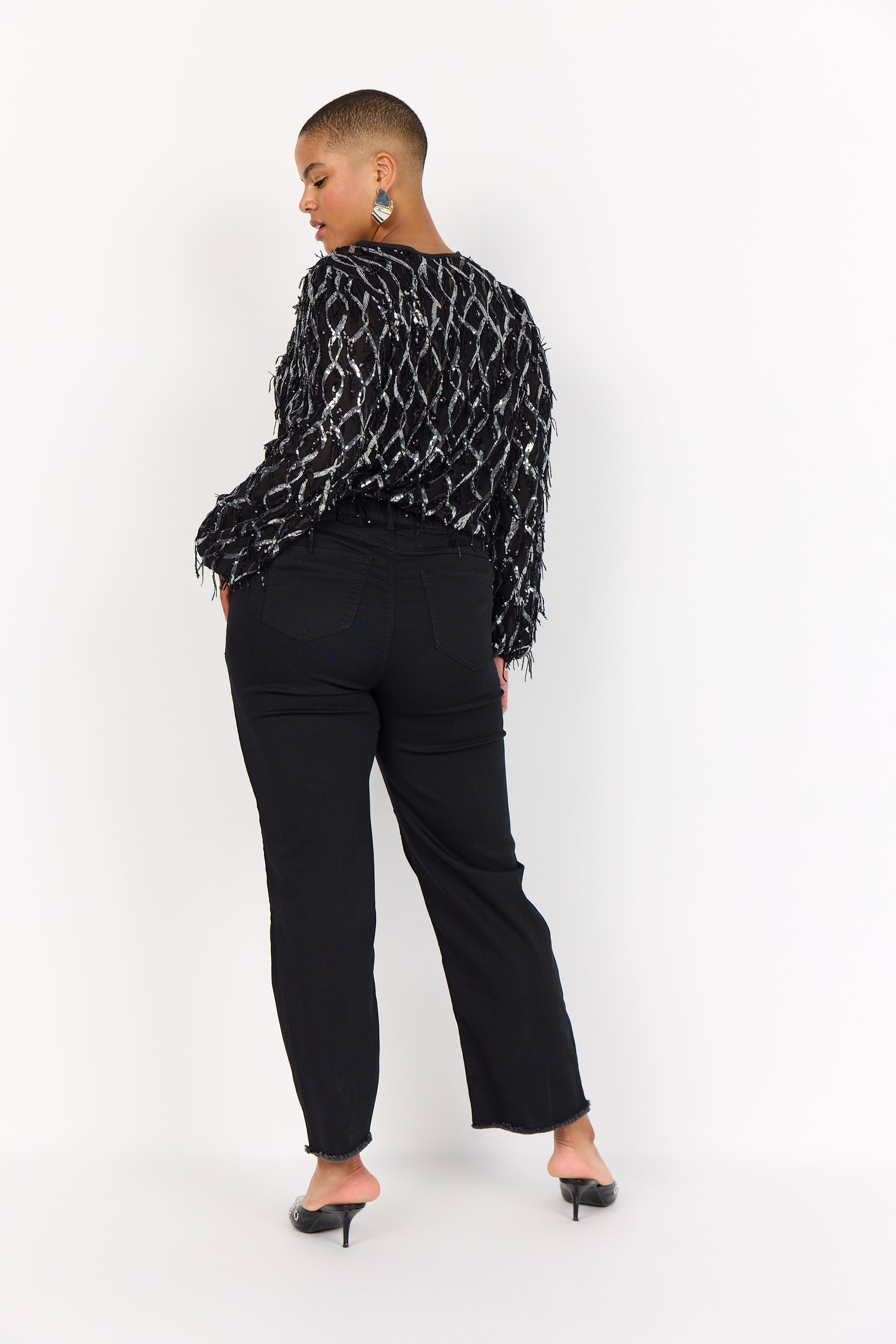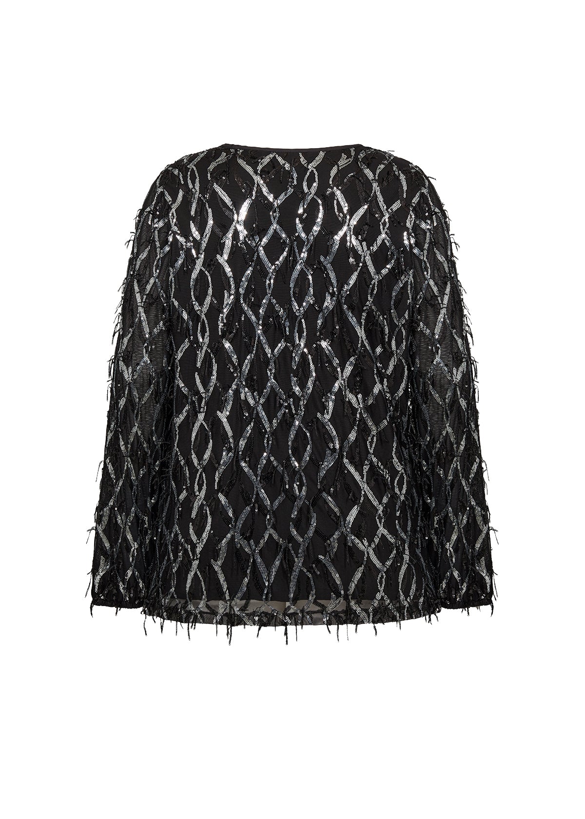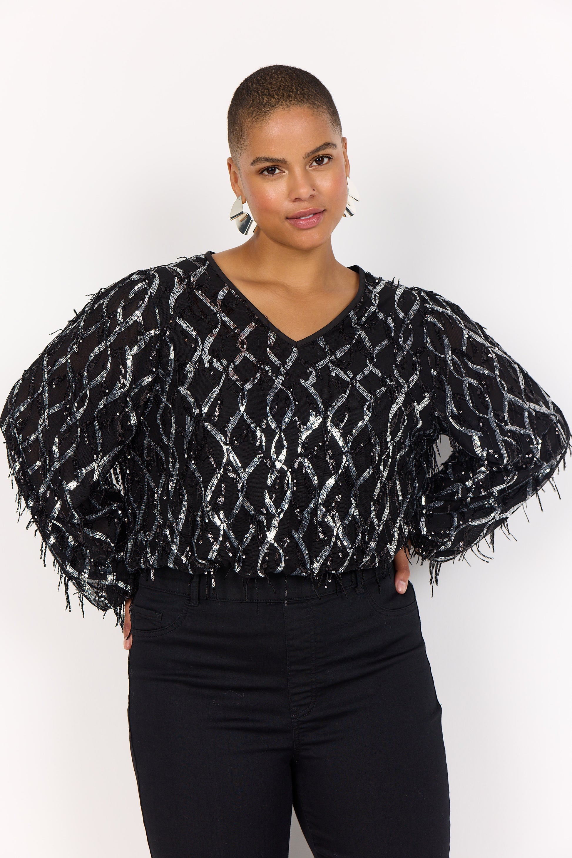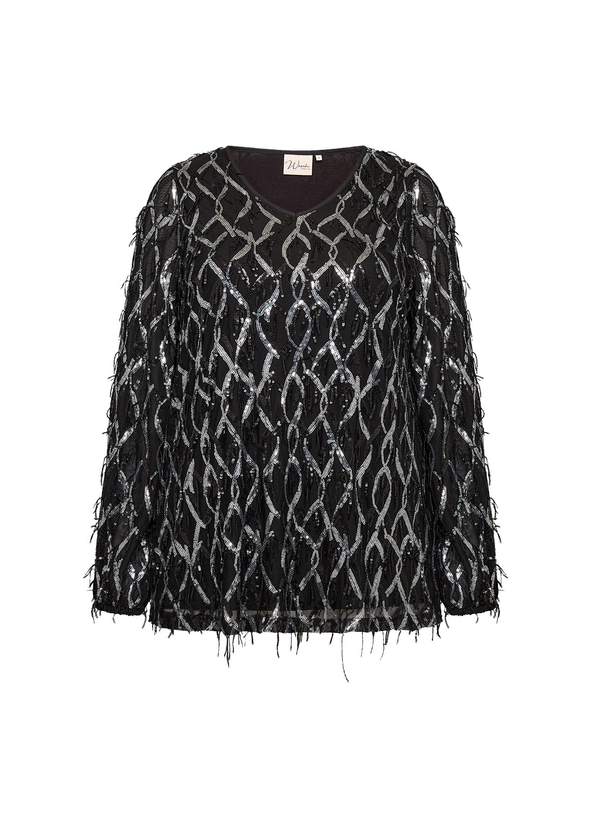 Blusen er fremstillet af 100% genbrugspolyester. Den har stilfulde lange ærmer, V-udskæring og et iøjnefaldende pailletmønster. Denne elegante bluse passer smukt sammen med skræddersyede bukser eller en elegant nederdel for et cool, sofistikeret look.