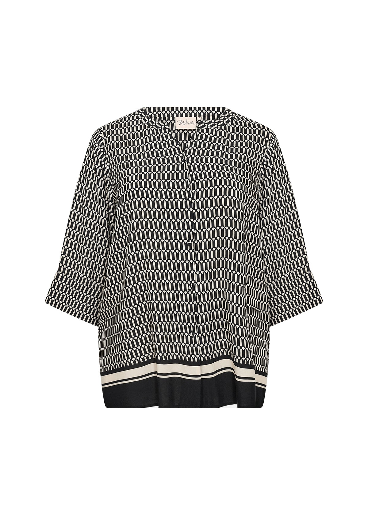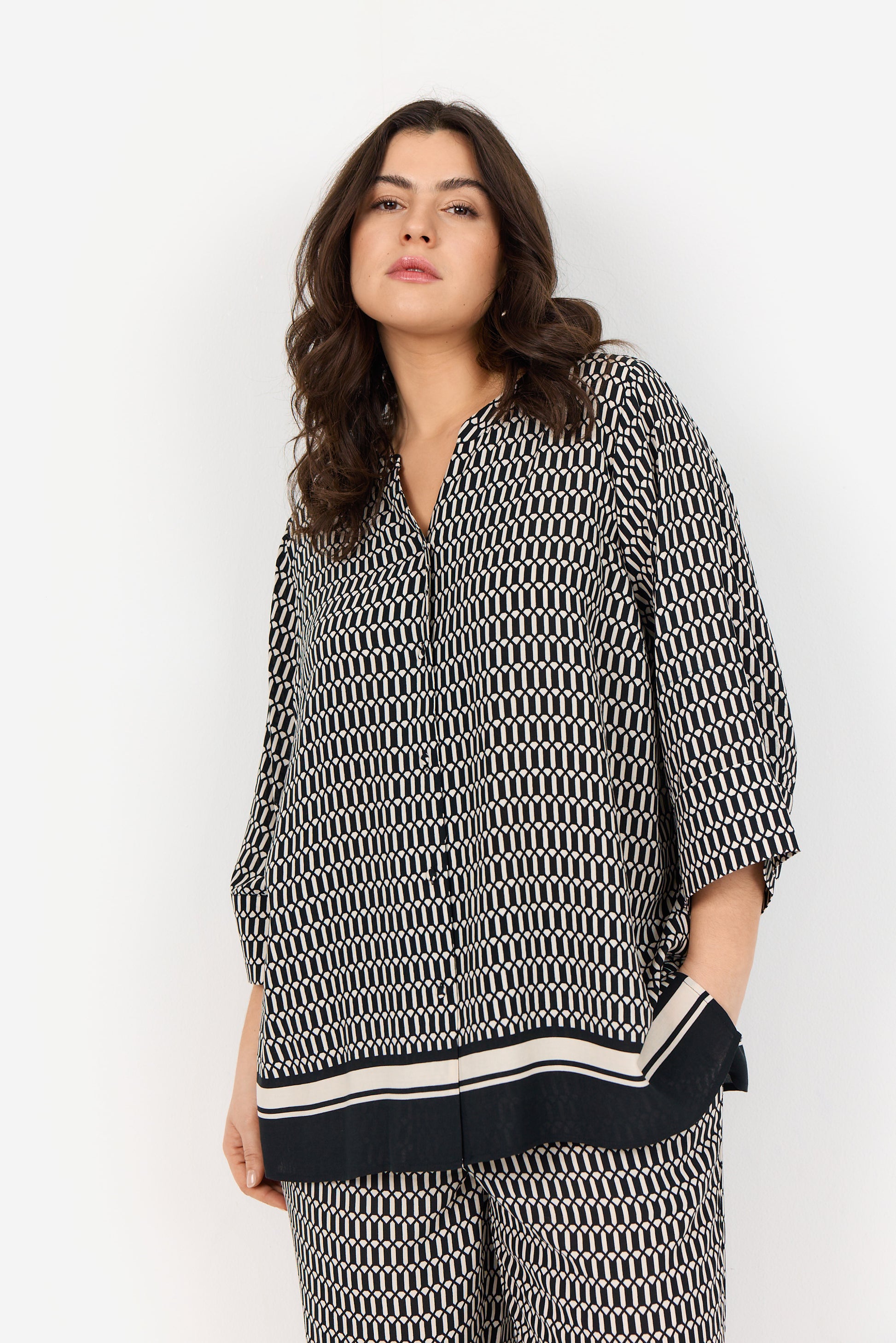 skjorten er fremstillet af 100 % LENZING™ ECOVERO™-viskose. Skjorten har en elegant v-hals, diskret knaplukning og et mellemlangt snit med et iøjnefaldende geometrisk print. Sæt den sammen med skræddersyede bukser eller afslappede jeans for et smart og stilfuldt look.